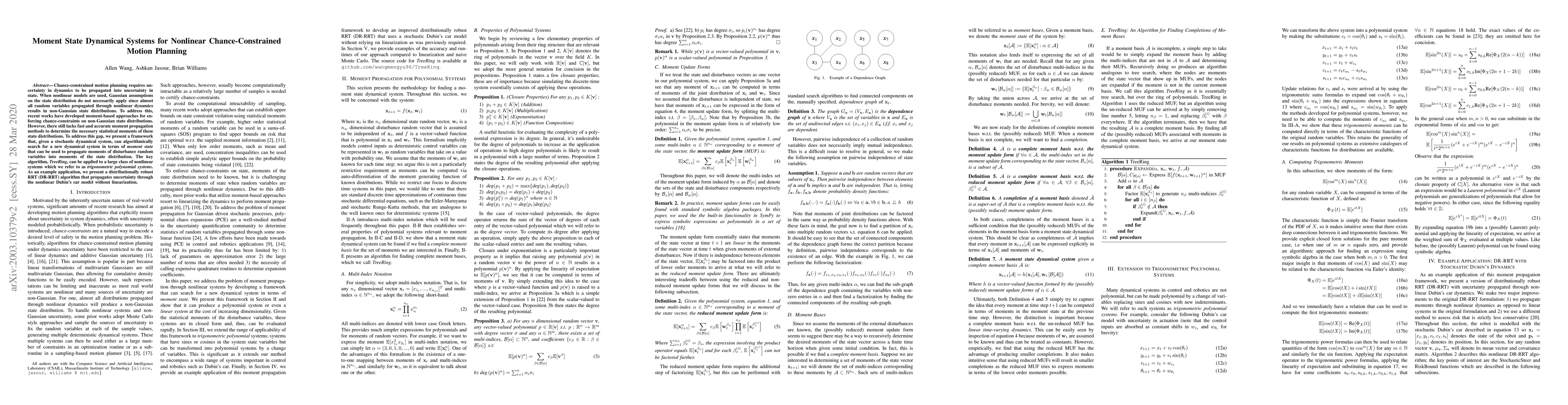 Chance-constrained motion planning requires uncertainty in dynamics to be propagated into uncertainty in state. When nonlinear models are used, Gaussian assumptions on the state distribution do not necessarily apply since almost all random variables propagated through nonlinear dynamics results in non-Gaussian state distributions. To address this, recent works have developed moment-based approaches for enforcing chance-constraints on non-Gaussian state distributions. However, there still lacks fast and accurate moment propagation methods to determine the necessary statistical moments of these state distributions. To address this gap, we present a framework that, given a stochastic dynamical system, can algorithmically search for a new dynamical system in terms of moment state that can be used to propagate moments of disturbance random variables into moments of the state distribution. The key algorithm, TreeRing, can be applied to a large class of nonlinear systems which we refer to as trigonometric polynomial systems. As an example application, we present a distributionally robust RRT (DR-RRT) algorithm that propagates uncertainty through the nonlinear Dubin's car model without linearization.