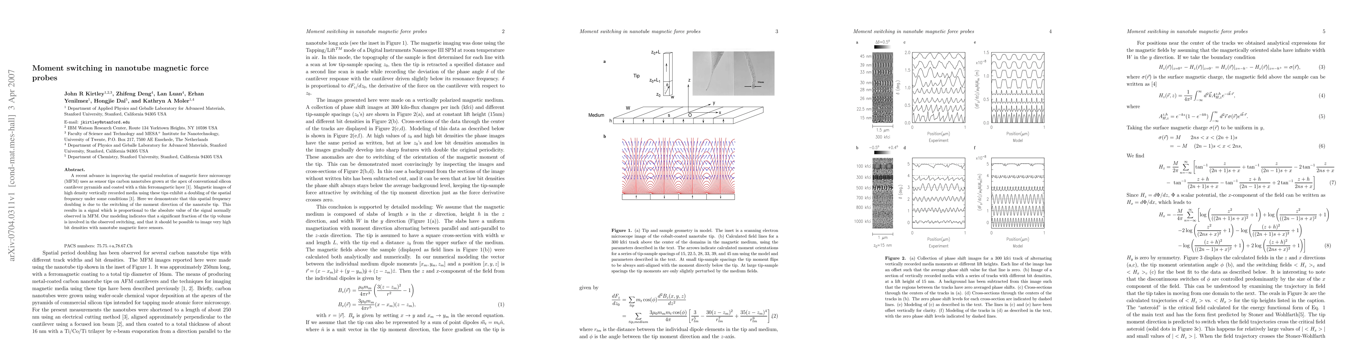 This paper explores the enhanced spatial resolution in magnetic force microscopy using carbon nanotube tips, revealing that spatial frequency doubling is due to the moment switching of the nanotube tip, enabling imaging of high bit densities. Modeling suggests a substantial tip volume involvement in this switching, promising advanced magnetic imaging capabilities.