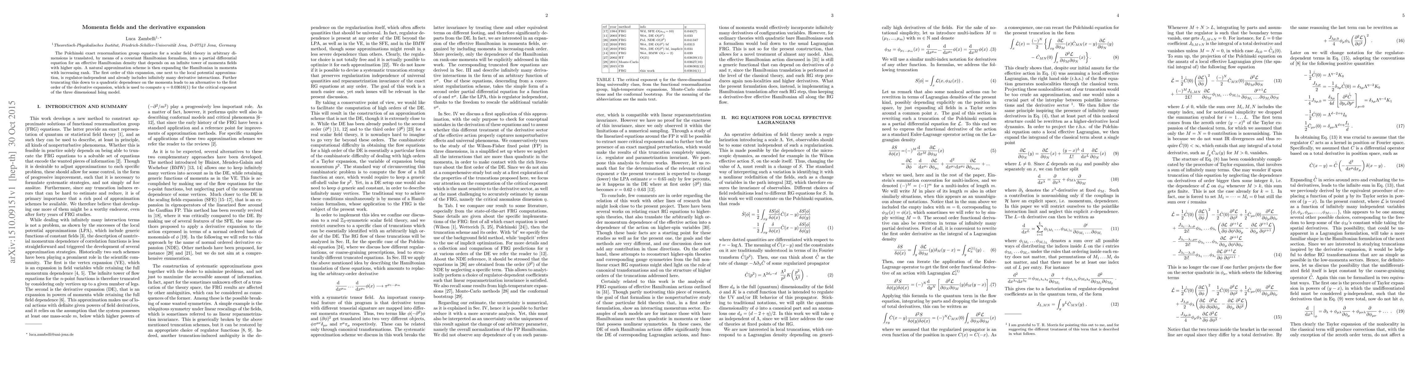 The Polchinski exact renormalization group equation for a scalar field theory in arbitrary dimensions is translated, by means of a covariant Hamiltonian formalism, into a partial differential equation for an effective Hamiltonian density that depends on an infinite tower of momenta fields with higher spin. A natural approximation scheme is then expanding the Hamiltonian in momenta with increasing rank. The first order of this expansion, one next to the local potential approximation, is regulator-independent and already includes infinitely many derivative interactions. Further truncating this down to a quadratic dependence on the momenta leads to an alternative to the first order of the derivative expansion, which is used to compute $\eta=0.03616(1)$ for the critical exponent of the three dimensional Ising model.