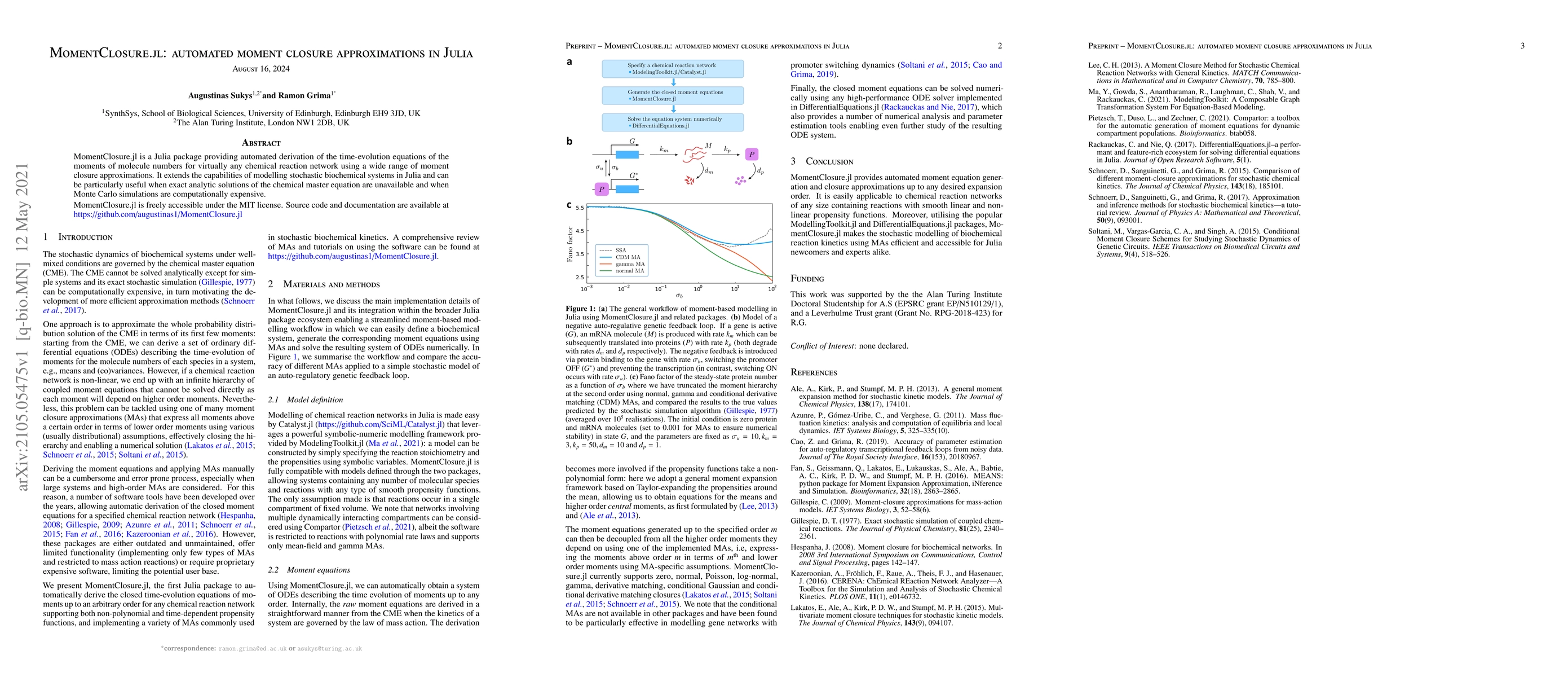 MomentClosure.jl is a Julia package providing automated derivation of the time-evolution equations of the moments of molecule numbers for virtually any chemical reaction network using a wide range of moment closure approximations. It extends the capabilities of modelling stochastic biochemical systems in Julia and can be particularly useful when exact analytic solutions of the chemical master equation are unavailable and when Monte Carlo simulations are computationally expensive. MomentClosure.jl is freely accessible under the MIT license. Source code and documentation are available at https://github.com/augustinas1/MomentClosure.jl