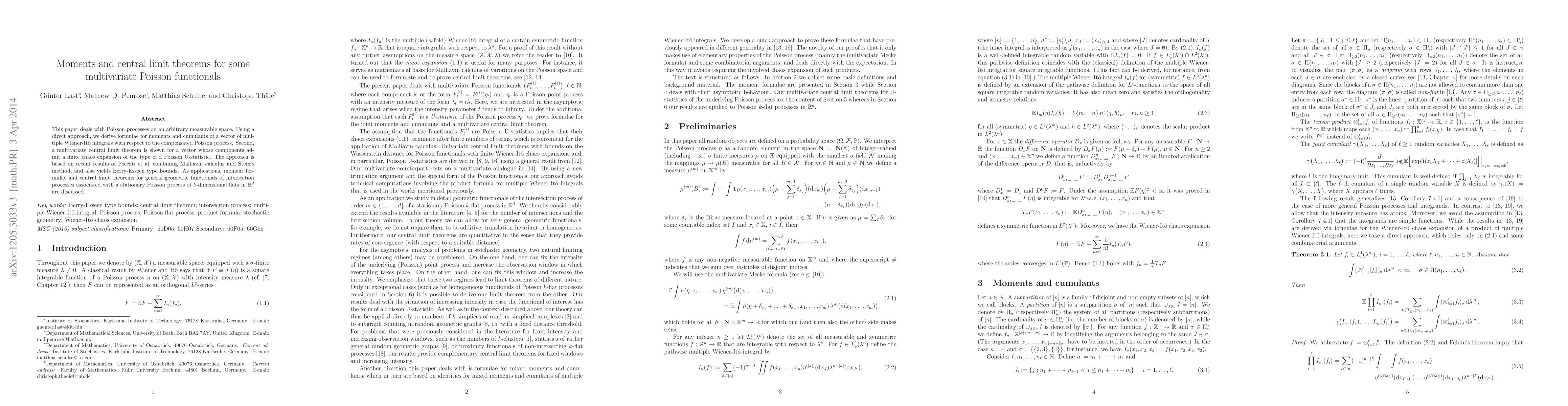 This paper derives moments and cumulants for multivariate Poisson functionals via multiple Wiener-Itô integrals and establishes a multivariate central limit theorem for Poisson U-statistics, providing Berry-Esseen bounds and applications to geometric functionals of intersection processes.