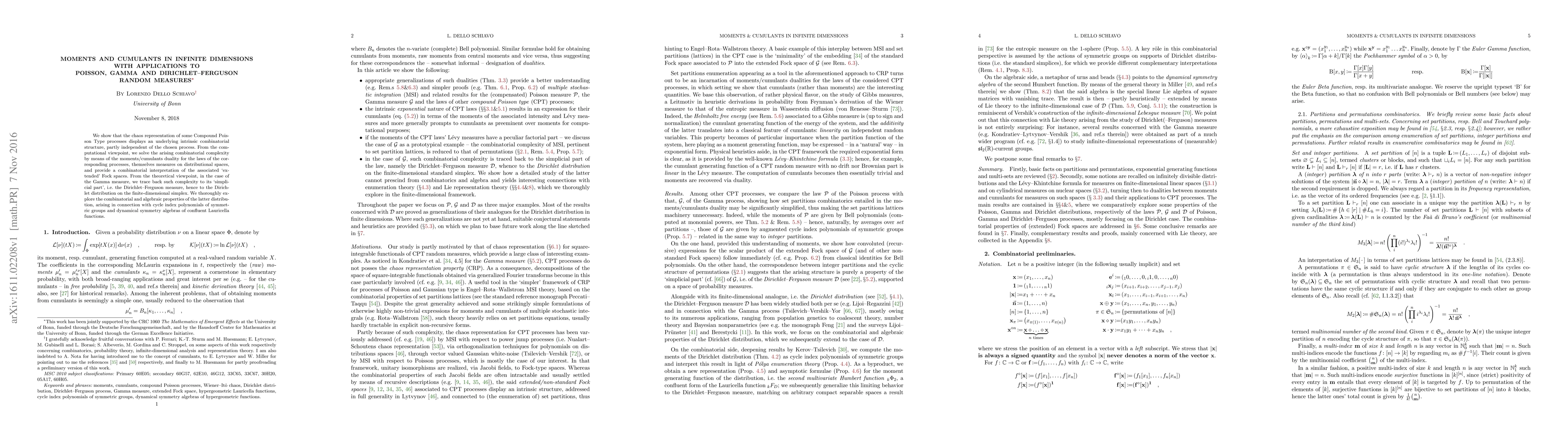 We show that the chaos representation of some Compound Poisson Type processes displays an underlying intrinsic combinatorial structure, partly independent of the chosen process. From the computational viewpoint, we solve the arising combinatorial complexity by means of the moments/cumulants duality for the laws of the corresponding processes, themselves measures on distributional spaces, and provide a combinatorial interpretation of the associated 'extended' Fock spaces. From the theoretical viewpoint, in the case of the Gamma measure, we trace back such complexity to its 'simplicial part', i.e. the Dirichlet-Ferguson measure, hence to the Dirichlet distribution on the finite-dimensional simplex. We thoroughly explore the combinatorial and algebraic properties of the latter distribution, arising in connection with cycle index polynomials of symmetric groups and dynamical symmetry algebras of confluent Lauricella functions.