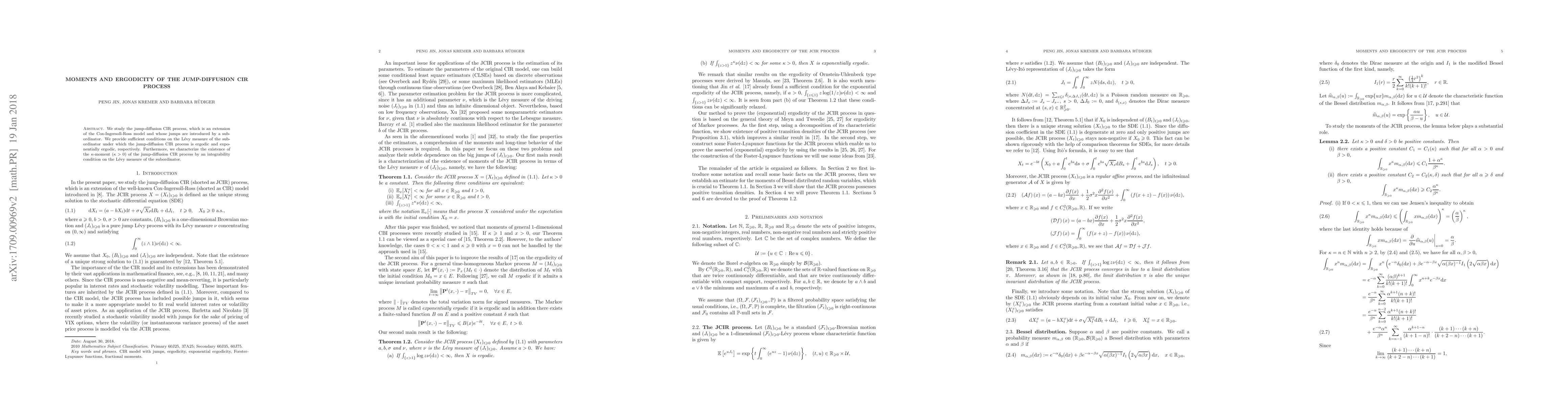 The paper studies the jump-diffusion CIR process, providing conditions for ergodicity and exponential ergodicity of the process based on the Lévy measure of the subordinator. It also characterizes the existence of specific moments of the process by an integrability condition on the Lévy measure.