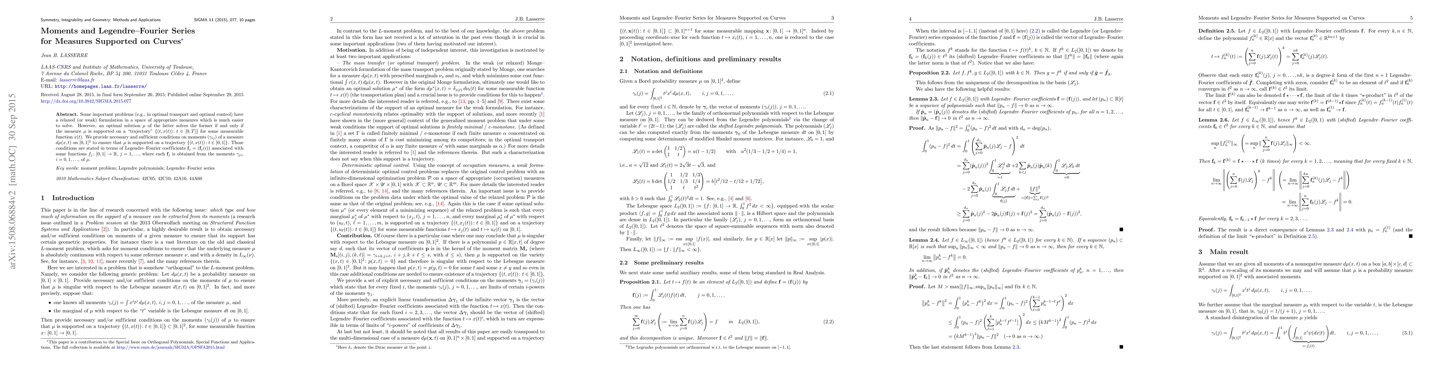 Some important problems (e.g., in optimal transport and optimal control) have a relaxed (or weak) formulation in a space of appropriate measures whichis much easier to solve. However, an optimal solution $\mu$ of the latter solves the former if and only if the measure $\mu$ is supported on a "trajectory" $\{(t,x(t))\colon t\in [0,T]\}$ for some measurable function $x(t)$. We provide necessary and sufficient conditions on moments $(\gamma\_{ij})$ of a measure $d\mu(x,t)$ on $[0,1]^2$ to ensure that $\mu$ is supported on a trajectory $\{(t,x(t))\colon t\in [0,1]\}$. Those conditions are stated in terms of Legendre-Fourier coefficients ${\mathbf f}\_j=({\mathbf f}\_j(i))$ associated with some functions $f\_j\colon [0,1]\to {\mathbb R}$, $j=1,\ldots$, where each ${\mathbf f}\_j$ is obtained from the moments $\gamma\_{ji}$, $i=0,1,\ldots$, of $\mu$.