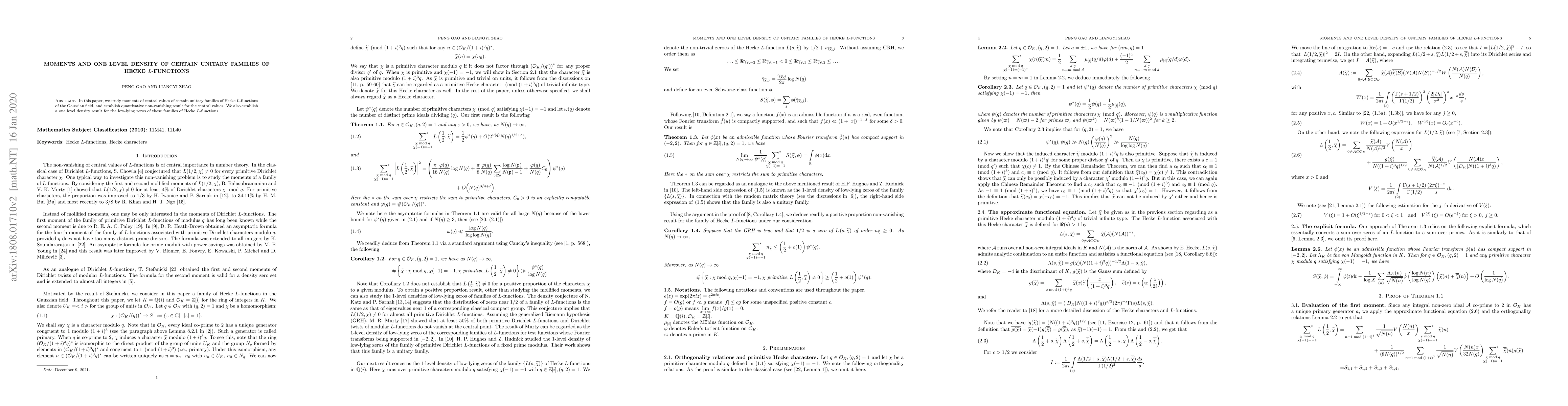 This paper investigates moments of central values of unitary families of Hecke $L$-functions associated with the Gaussian field, proving a quantitative non-vanishing result. Additionally, it establishes a one level density result for the low-lying zeros of these $L$-functions.