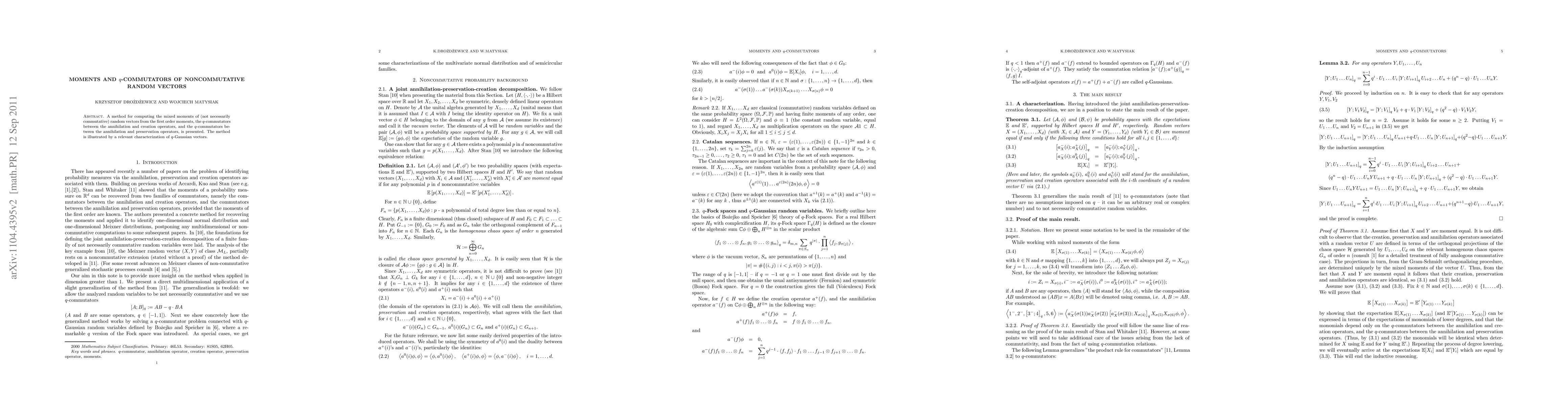 This paper presents a method to compute mixed moments of noncommutative random vectors using first-order moments and $q$-commutators, and applies it to characterize $q$-Gaussian vectors. The approach leverages $q$-commutator relations between annihilation and creation/preservation operators.