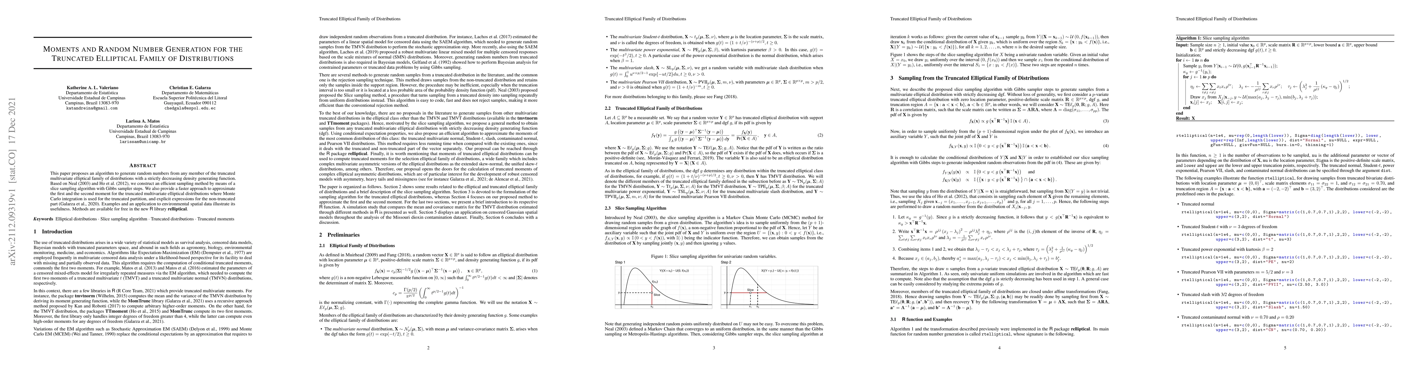 The paper proposes an algorithm for generating random numbers from the truncated multivariate elliptical family using a slice sampling algorithm with Gibbs sampler steps, and presents an efficient method to approximate the first and second moments for these distributions.