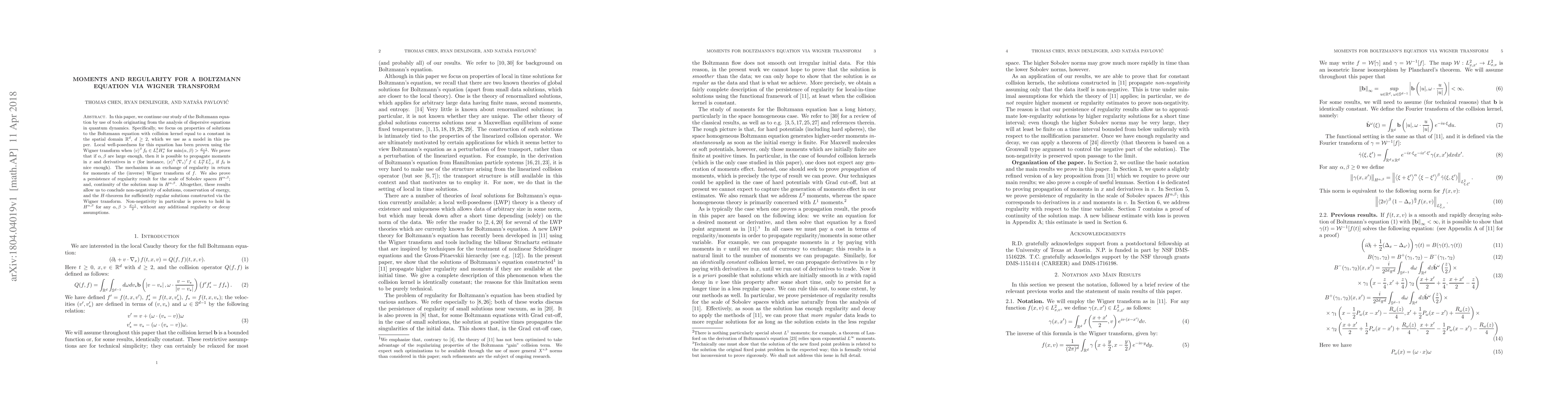 In this paper, we continue our study of the Boltzmann equation by use of tools originating from the analysis of dispersive equations in quantum dynamics. Specifically, we focus on properties of solutions to the Boltzmann equation with collision kernel equal to a constant in the spatial domain $\mathbb{R}^d$, $d\geq 2$, which we use as a model in this paper. Local well-posedness for this equation has been proven using the Wigner transform when $\left< v \right>^\beta f_0 \in L^2_v H^\alpha_x$ for $\min (\alpha,\beta) > \frac{d-1}{2}$. We prove that if $\alpha,\beta$ are large enough, then it is possible to propagate moments in $x$ and derivatives in $v$ (for instance, $\left< x \right>^k \left< \nabla_v \right>^\ell f \in L^\infty_T L^2_{x,v}$ if $f_0$ is nice enough). The mechanism is an exchange of regularity in return for moments of the (inverse) Wigner transform of $f$. We also prove a persistence of regularity result for the scale of Sobolev spaces $H^{\alpha,\beta}$; and, continuity of the solution map in $H^{\alpha,\beta}$. Altogether, these results allow us to conclude non-negativity of solutions, conservation of energy, and the $H$-theorem for sufficiently regular solutions constructed via the Wigner transform. Non-negativity in particular is proven to hold in $H^{\alpha,\beta}$ for any $\alpha,\beta > \frac{d-1}{2}$, without any additional regularity or decay assumptions.