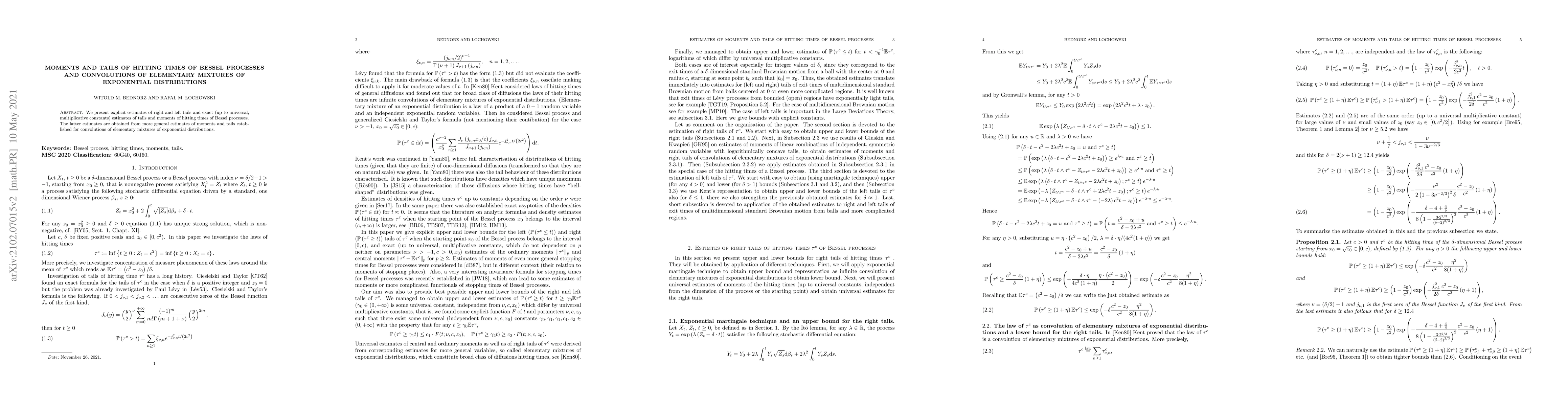This paper provides precise estimates for the tails and moments of hitting times of Bessel processes, derived from analogous estimates for convolutions of elementary mixtures of exponential distributions. The results include explicit estimates for both right and left tails, and exact tail and moment estimates up to universal multiplicative constants.