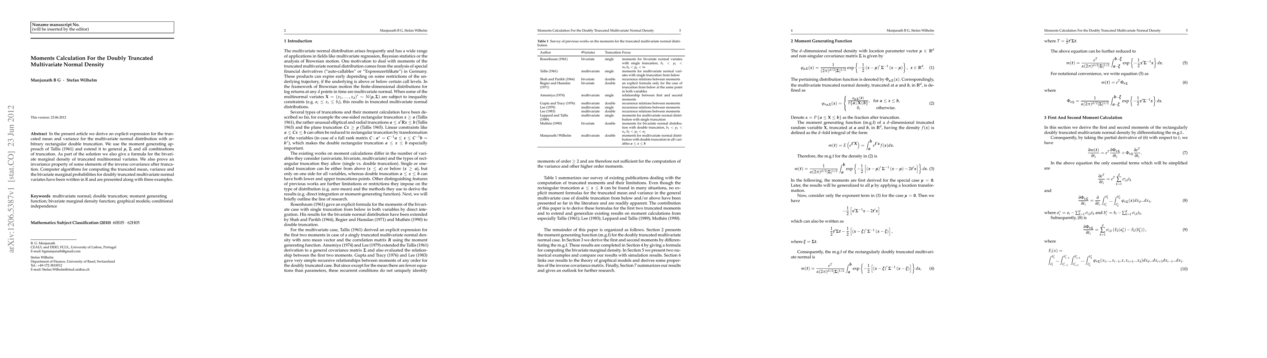 In the present article we derive an explicit expression for the trun- cated mean and variance for the multivariate normal distribution with ar- bitrary rectangular double truncation. We use the moment generating ap- proach of Tallis (1961) and extend it to general {\mu}, {\Sigma} and all combinations of truncation. As part of the solution we also give a formula for the bivari- ate marginal density of truncated multinormal variates. We also prove an invariance property of some elements of the inverse covariance after trunca- tion. Computer algorithms for computing the truncated mean, variance and the bivariate marginal probabilities for doubly truncated multivariate normal variates have been written in R and are presented along with three examples.
