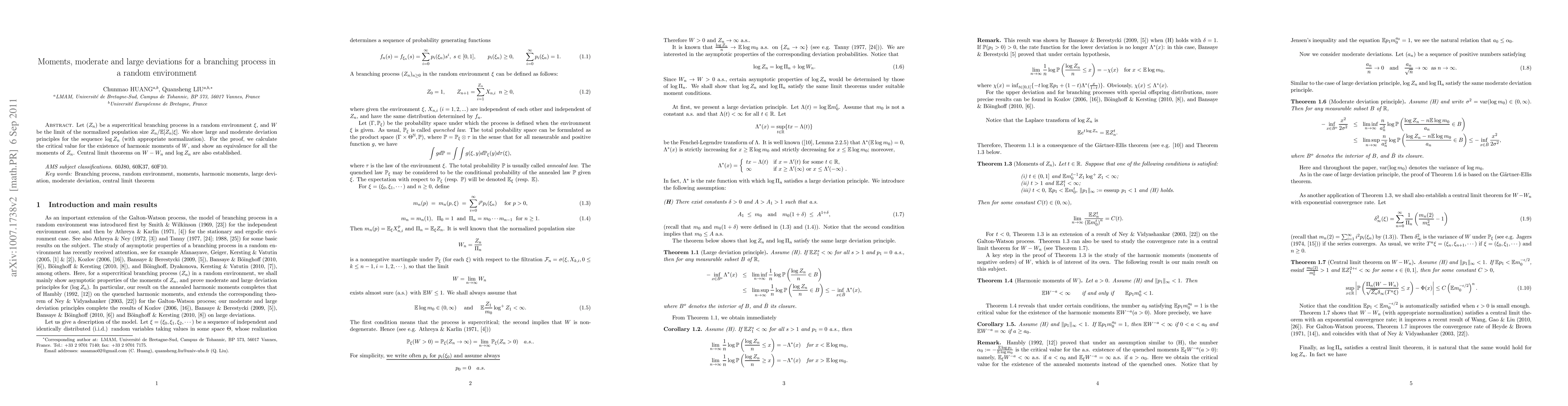 This paper investigates a supercritical branching process in a random environment, establishing large and moderate deviation principles for the normalized population size. It also proves central limit theorems and examines the critical value for harmonic moments, demonstrating equivalence for all moments of the population size.