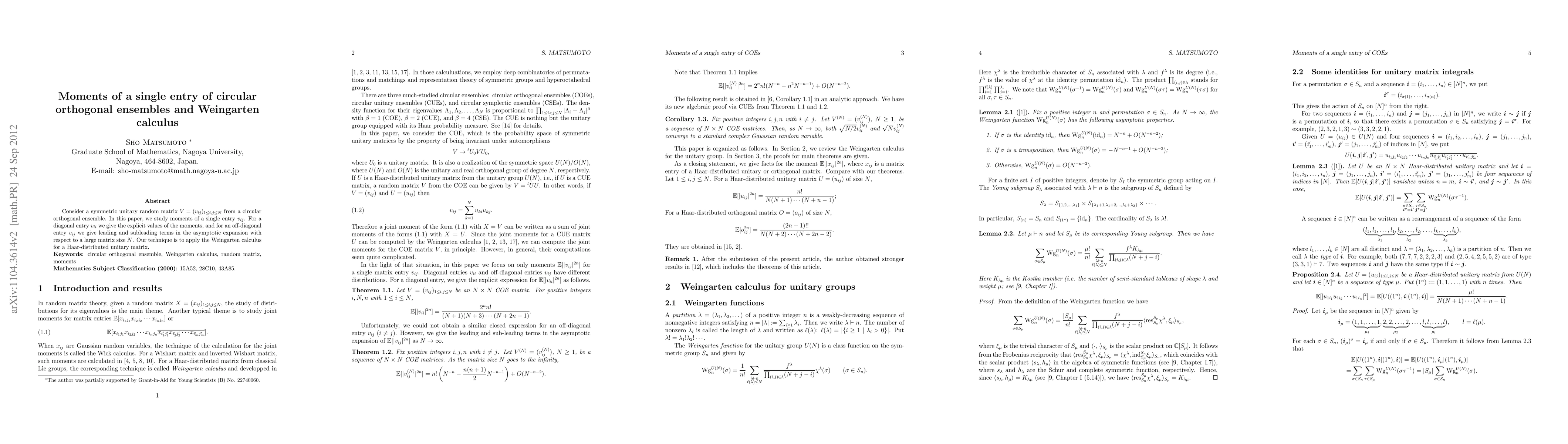 The research applies the Weingarten calculus for a Haar-distributed unitary matrix to study moments of a single entry of circular orthogonal ensembles (COE).