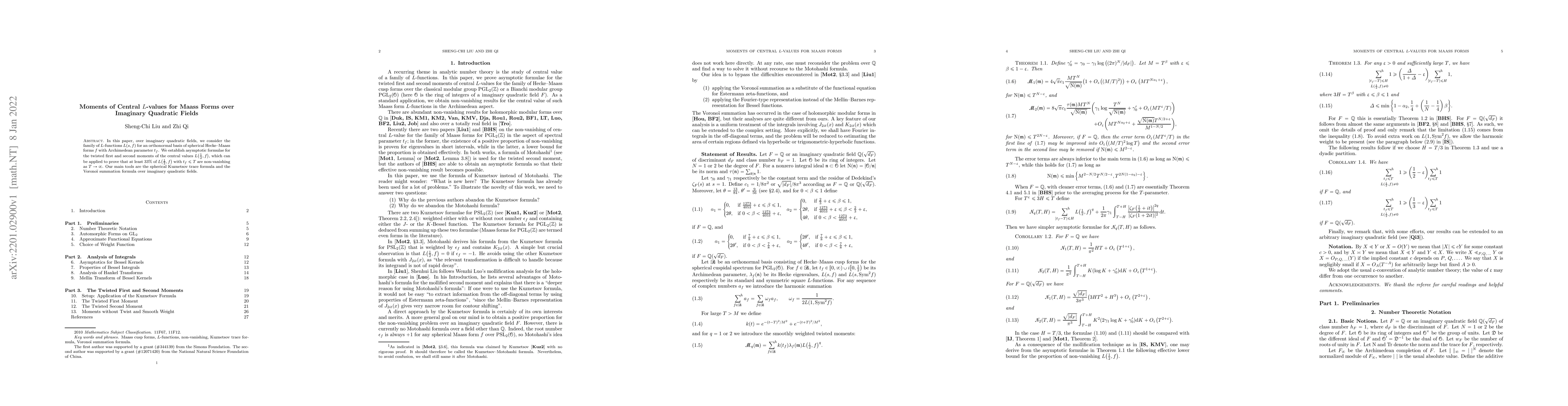 In this paper, over imaginary quadratic fields, we consider the family of $L$-functions $L (s, f)$ for an orthonormal basis of spherical Hecke--Maass forms $f$ with Archimedean parameter $t_f$. We establish asymptotic formulae for the twisted first and second moments of the central values $L\big(\frac 1 2, f\big)$, which can be applied to prove that at least $33 \%$ of $L\big(\frac 1 2, f\big)$ with $t_f \leqslant T$ are non-vanishing as $T \rightarrow \infty$. Our main tools are the spherical Kuznetsov trace formula and the Vorono\"i summation formula over imaginary quadratic fields.