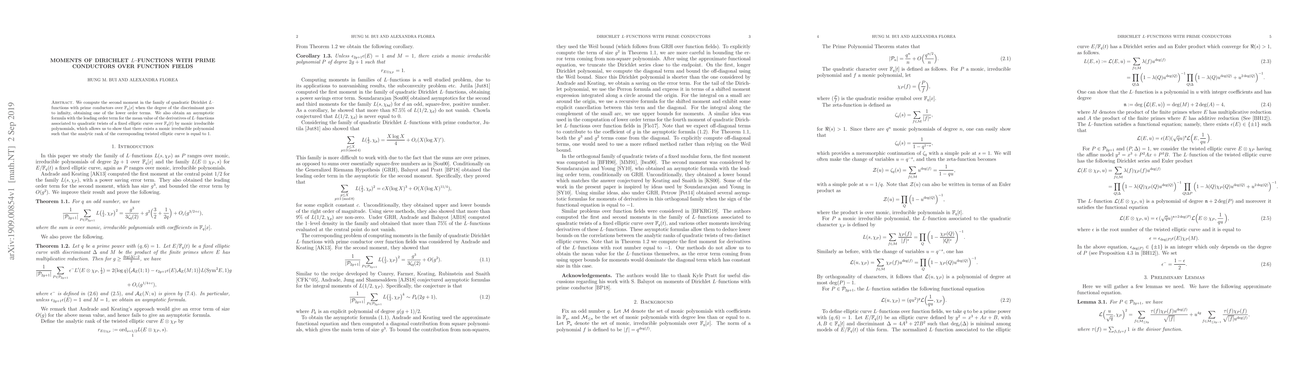 The study calculates the second moment for quadratic Dirichlet $L$-functions with prime conductors over $\mathbb{F}_q[x]$ as the discriminant degree tends to infinity, finding a lower order term. Additionally, it provides an asymptotic formula for the mean value of derivatives of $L$-functions associated with quadratic twists of a fixed elliptic curve over $\mathbb{F}_q(t)$, revealing the existence of a polynomial ensuring the twisted curve's analytic rank equals 1.