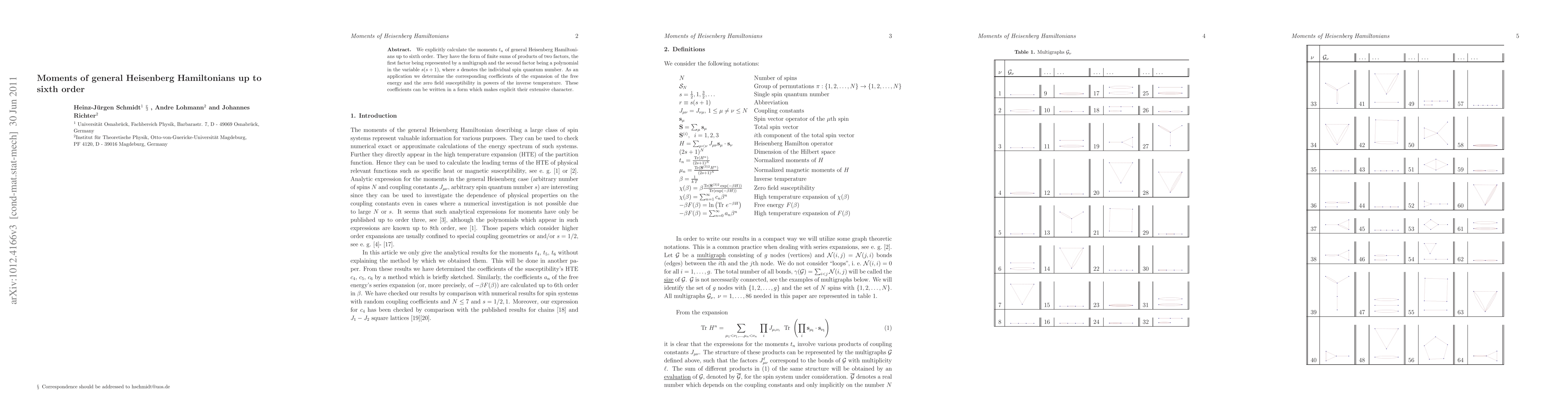We explicitly calculate the moments t_n of general Heisenberg Hamiltonians up to sixth order. They have the form of finite sums of products of two factors, the first factor being represented by a multigraph and the second factor being a polynomial in the variable s(s + 1), where s denotes the individual spin quantum number. As an application we determine the corresponding coefficients of the expansion of the free energy and the zero field susceptibility in powers of the inverse temperature. These coefficients can be written in a form which makes explicit their extensive character.