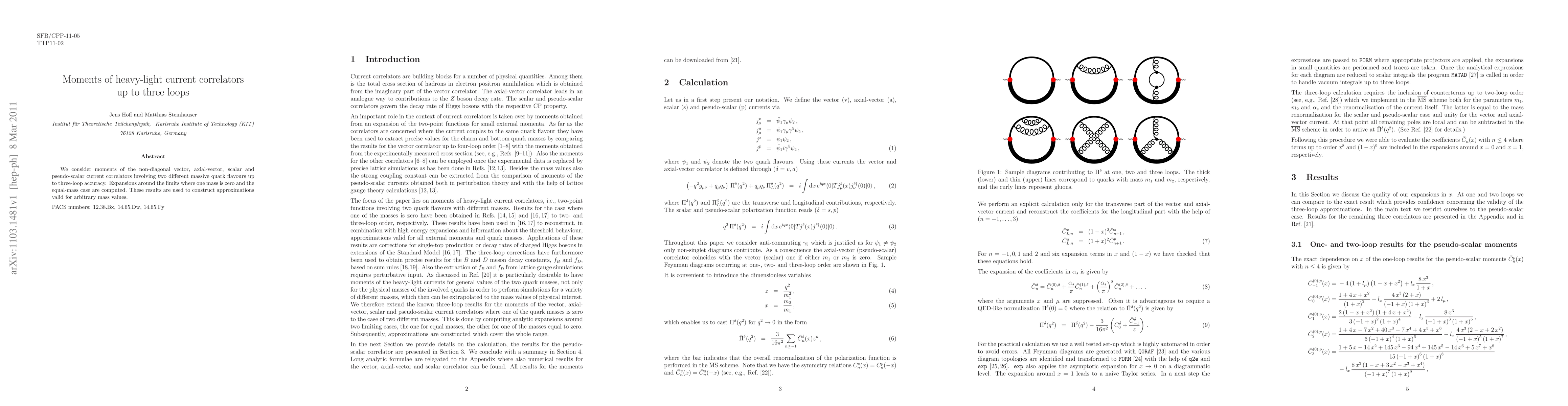This paper computes the moments of heavy-light current correlators up to three-loop accuracy, focusing on non-diagonal vector, axial-vector, scalar, and pseudo-scalar correlators involving two different massive quark flavors. It also provides expansions for limits where one mass approaches zero and the equal-mass scenario.