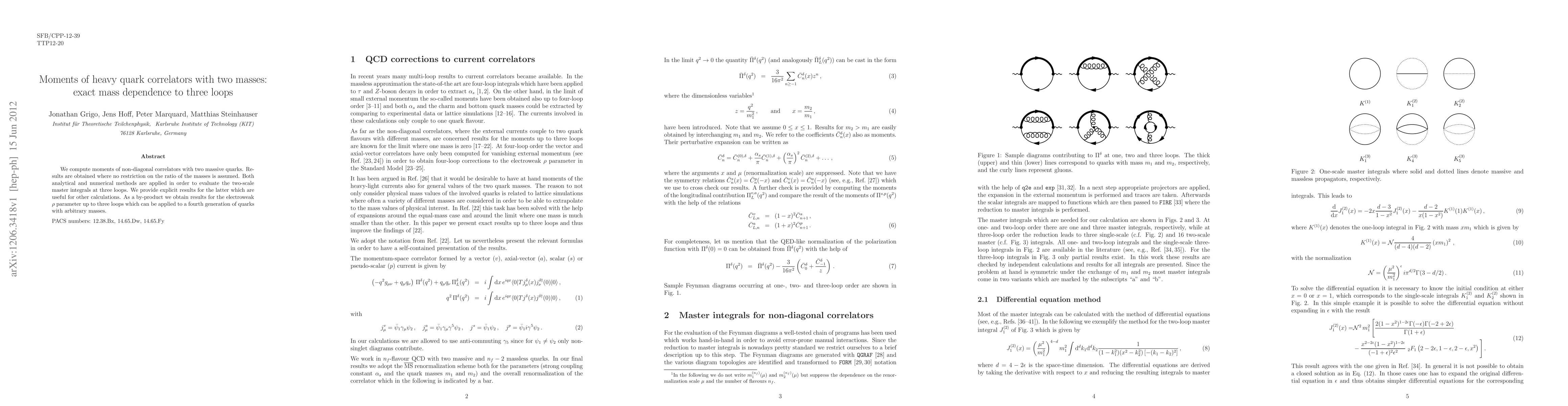 This paper computes moments of non-diagonal correlators for two massive quarks, providing exact mass dependence up to three loops using both analytical and numerical methods. The results include explicit expressions for two-scale master integrals and implications for the electroweak $\rho$ parameter in the context of a fourth generation of quarks.