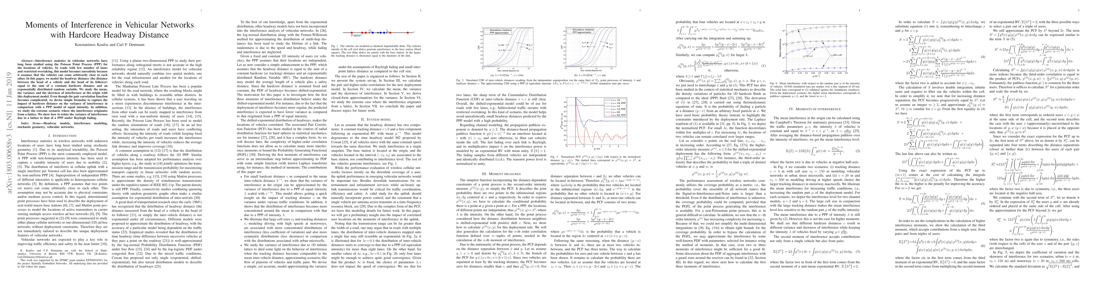 This paper models vehicular networks with a hardcore headway distance, combining a constant minimum distance and an exponentially distributed random variable, to better reflect restricted overtaking conditions. It examines the mean, variance, and skewness of interference, providing simple formulae to compare the impact of this model against the traditional Poisson Point Process.