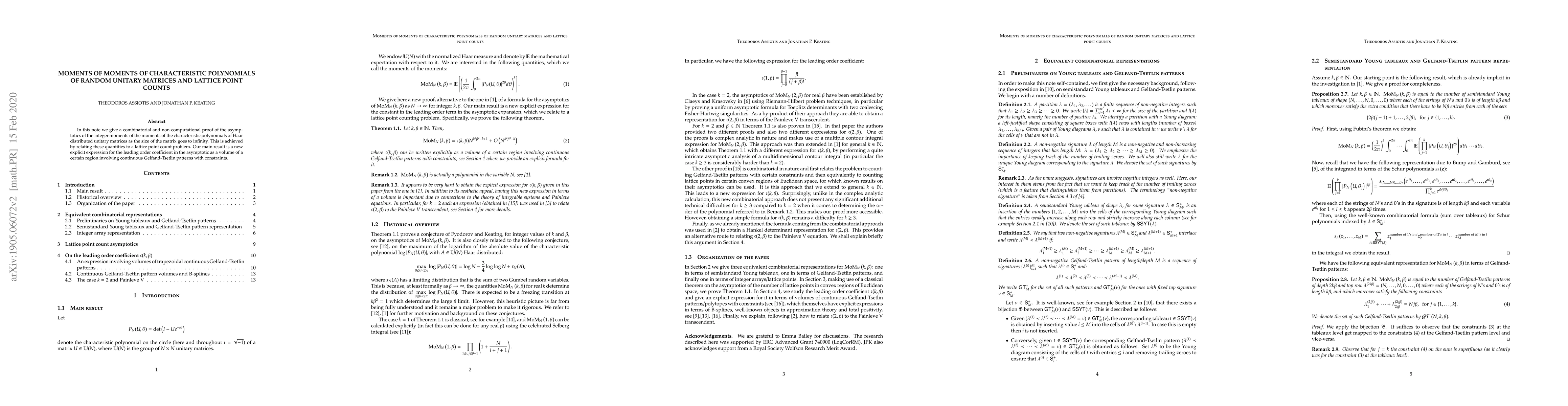 This paper provides a combinatorial proof for the asymptotics of integer moments of characteristic polynomials of large random unitary matrices, linking these moments to a lattice point count problem and deriving an explicit expression for the leading coefficient as a volume of a region involving continuous Gelfand-Tsetlin patterns.