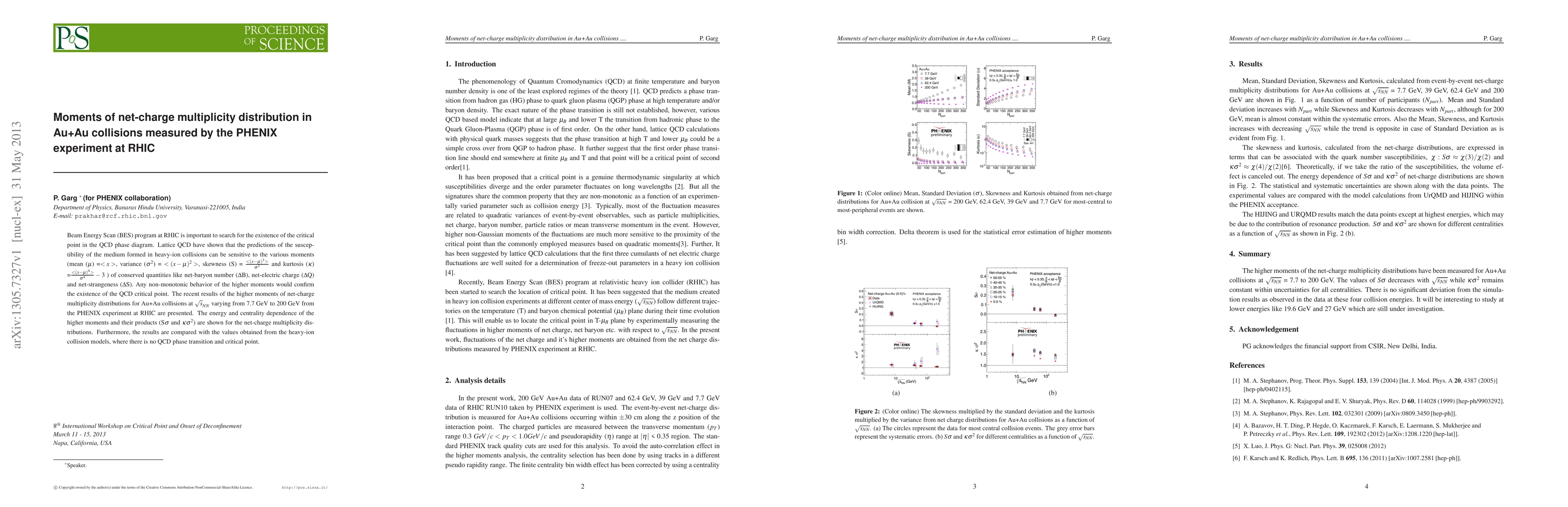 The PHENIX experiment at RHIC has analyzed the higher moments of net-charge multiplicity distributions in Au+Au collisions across varying beam energies to search for signs of the QCD critical point. The study reveals energy and centrality dependence of these moments and their products, comparing them to models without a QCD critical point.