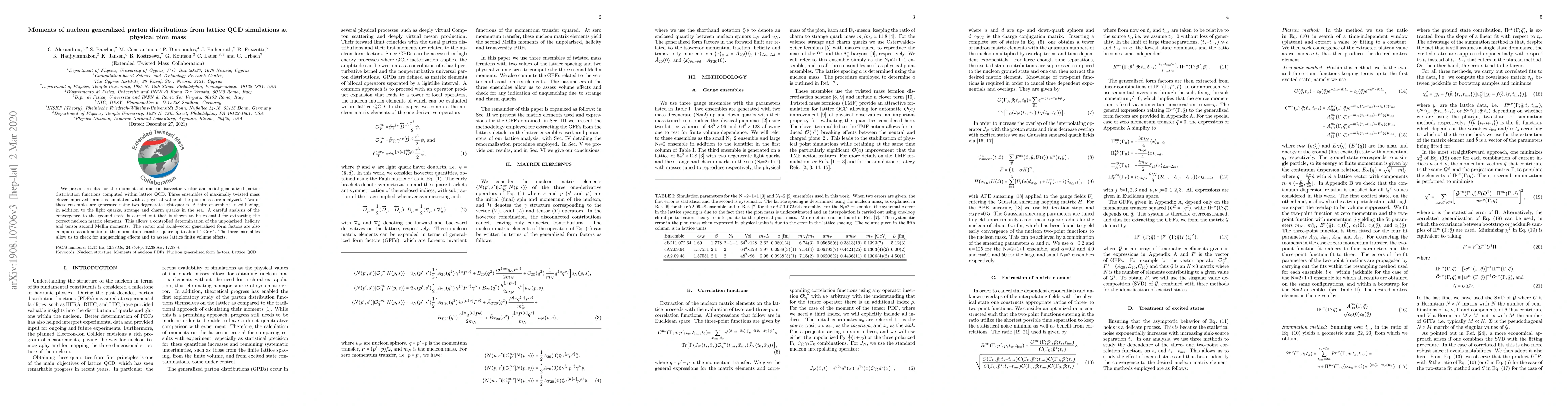 This study computes moments of nucleon generalized parton distribution functions using lattice QCD simulations at a physical pion mass, analyzing three ensembles with different quark configurations. The research focuses on extracting accurate nucleon matrix elements and assessing unquenching and finite volume effects.
