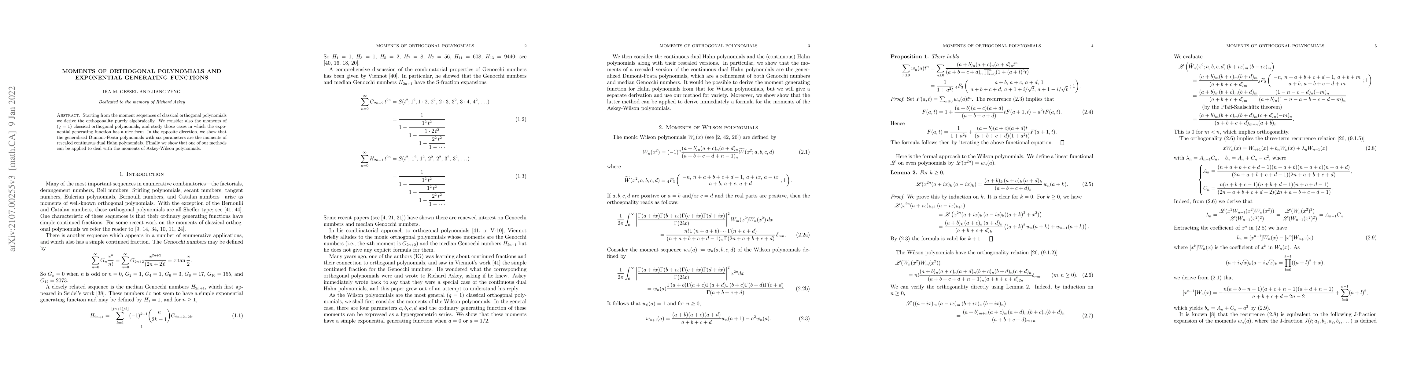 This paper derives algebraic expressions for moments of classical orthogonal polynomials, establishes connections between generating functions, and applies these methods to rescaled continuous dual Hahn polynomials and Askey-Wilson polynomials.