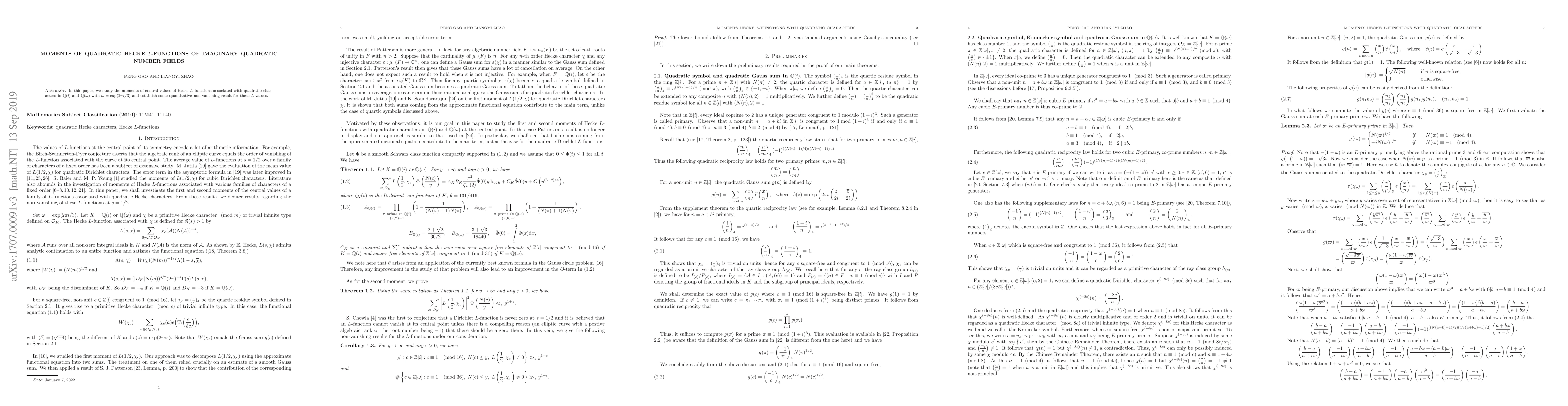 In this paper, we study the moments of central values of Hecke $L$-functions associated with quadratic characters in $\mathbb{Q}(i)$ and $\mathbb{Q}(\omega)$ with $\omega = exp(2\pi i/3)$ and establish some quantitative non-vanishing result for these $L$-values.