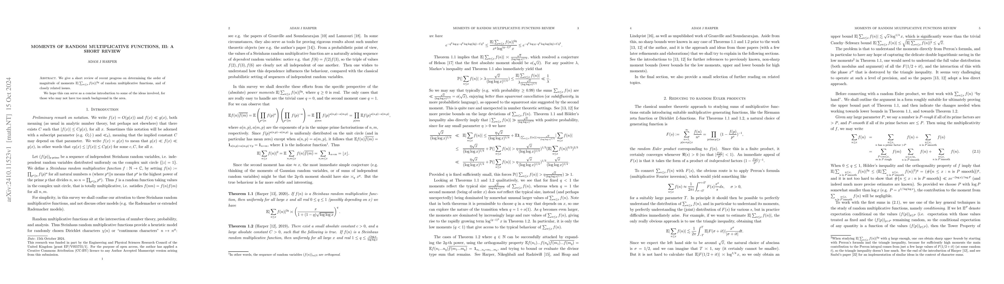 This paper provides a brief overview of recent advancements in determining the order of magnitude for moments of random multiplicative functions, aiming to introduce key ideas to those with limited background knowledge in the field.