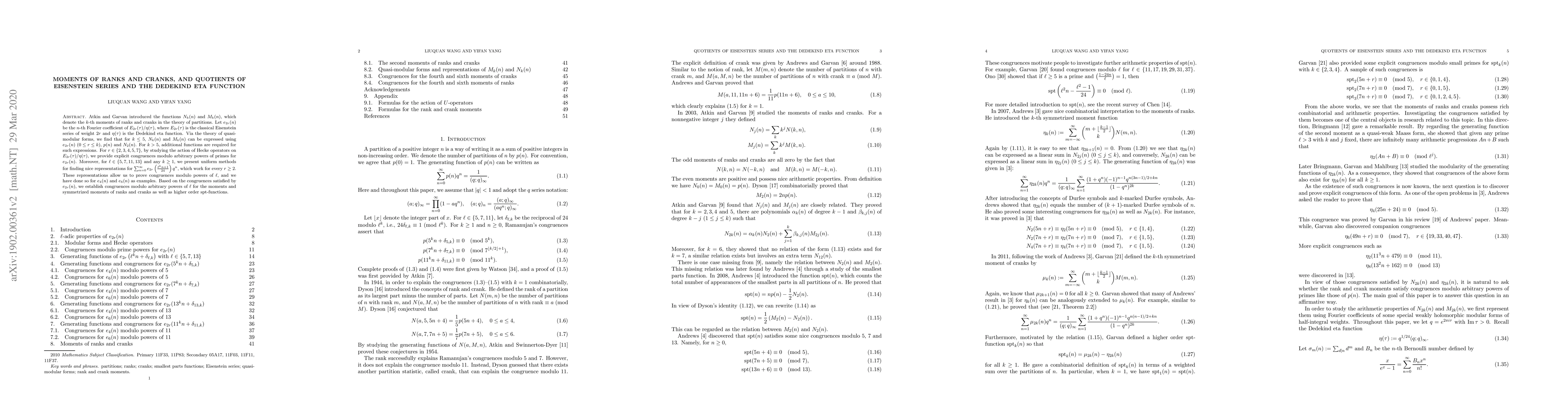 Atkin and Garvan introduced the functions $N_k(n)$ and $M_k(n)$, which denote the $k$-th moments of ranks and cranks in the theory of partitions. Let $e_{2r}(n)$ be the $n$-th Fourier coefficient of $E_{2r}(\tau)/\eta(\tau)$, where $E_{2r}(\tau)$ is the classical Eisenstein series of weight $2r$ and $\eta(\tau)$ is the Dedekind eta function. Via the theory of quasi-modular forms, we find that for $k \leq 5$, $N_k(n)$ and $M_k(n)$ can be expressed using $e_{2r}(n)$ ($2\leq r \leq k$), $p(n)$ and $N_2(n)$. For $k>5$, additional functions are required for such expressions. For $r\in \{2, 3, 4, 5, 7\}$, by studying the action of Hecke operators on $E_{2r}(\tau)/\eta(\tau)$, we provide explicit congruences modulo arbitrary powers of primes for $e_{2r}(n)$. Moreover, for $\ell \in \{5, 7, 11, 13\}$ and any $k\geq 1$, we present uniform methods for finding nice representations for $\sum_{n=0}^\infty e_{2r}\left(\frac{\ell^{k}n+1}{24}\right)q^n$, which work for every $r\geq 2$. These representations allow us to prove congruences modulo powers of $\ell$, and we have done so for $e_4(n)$ and $e_6(n)$ as examples. Based on the congruences satisfied by $e_{2r}(n)$, we establish congruences modulo arbitrary powers of $\ell$ for the moments and symmetrized moments of ranks and cranks as well as higher order $\mathrm{spt}$-functions.