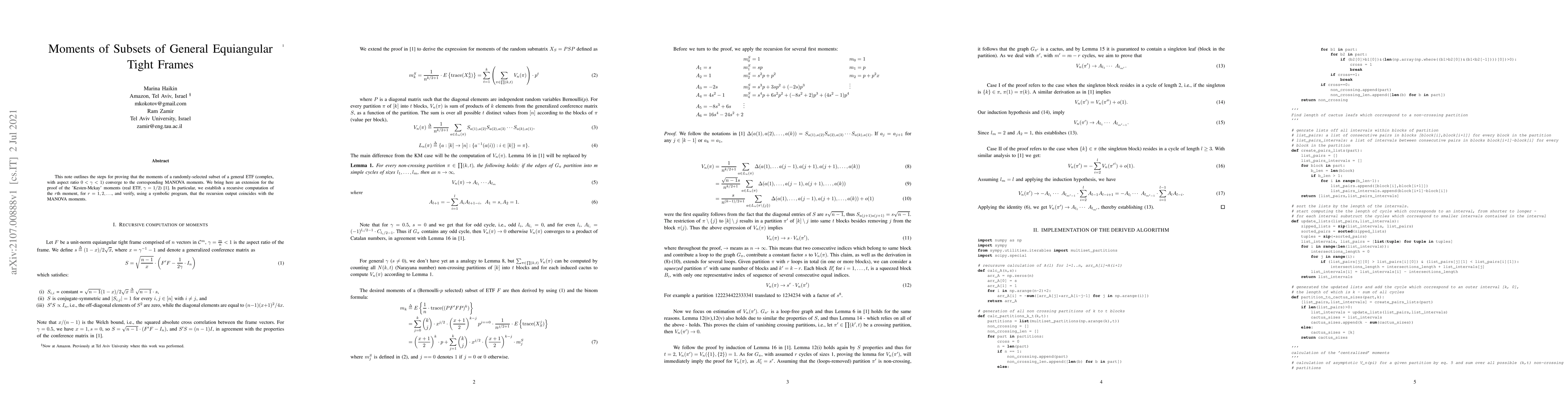 This note outlines the steps for proving that the moments of a randomly-selected subset of a general ETF (complex, with aspect ratio $0<\gamma<1$) converge to the corresponding MANOVA moments. We bring here an extension for the proof of the 'Kesten-Mckay' moments (real ETF, $\gamma=1/2$) \cite{magsino2020kesten}. In particular, we establish a recursive computation of the $r$th moment, for $r = 1,2,\ldots$, and verify, using a symbolic program, that the recursion output coincides with the MANOVA moments.
