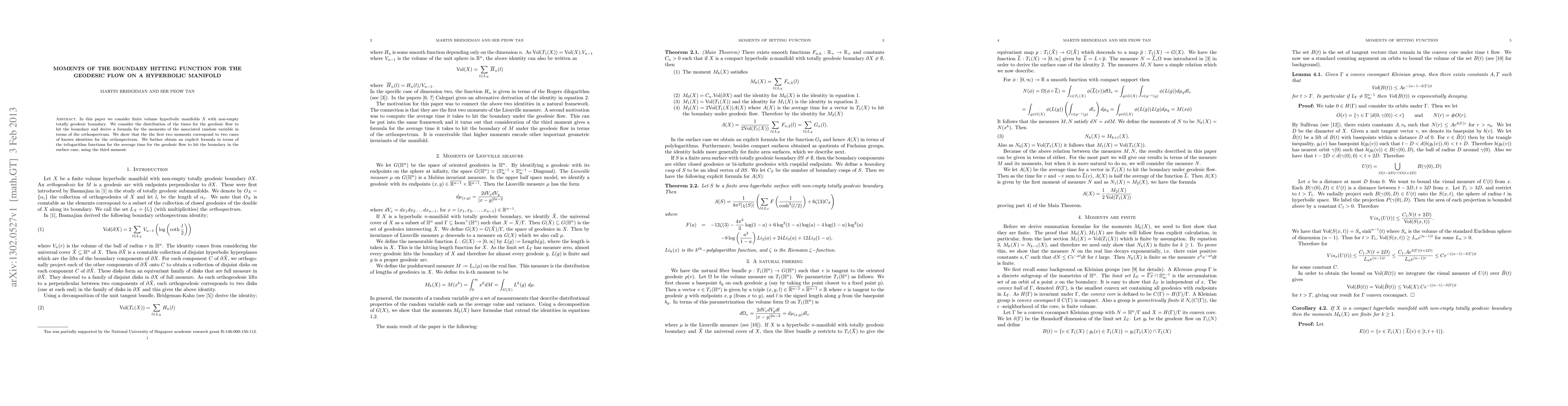 In this paper we consider finite volume hyperbolic manifolds X with non-empty totally geodesic boundary. We consider the distribution of the times for the geodesic flow to hit the boundary and derive a formula for the moments of the associated random variable in terms of the orthospectrum. We show that the the first two moments correspond to two cases of known identities for the orthospectrum. We further obtain an explicit formula in terms of the trilogarithm functions for the average time for the geodesic flow to hit the boundary in the surface case, using the third moment.