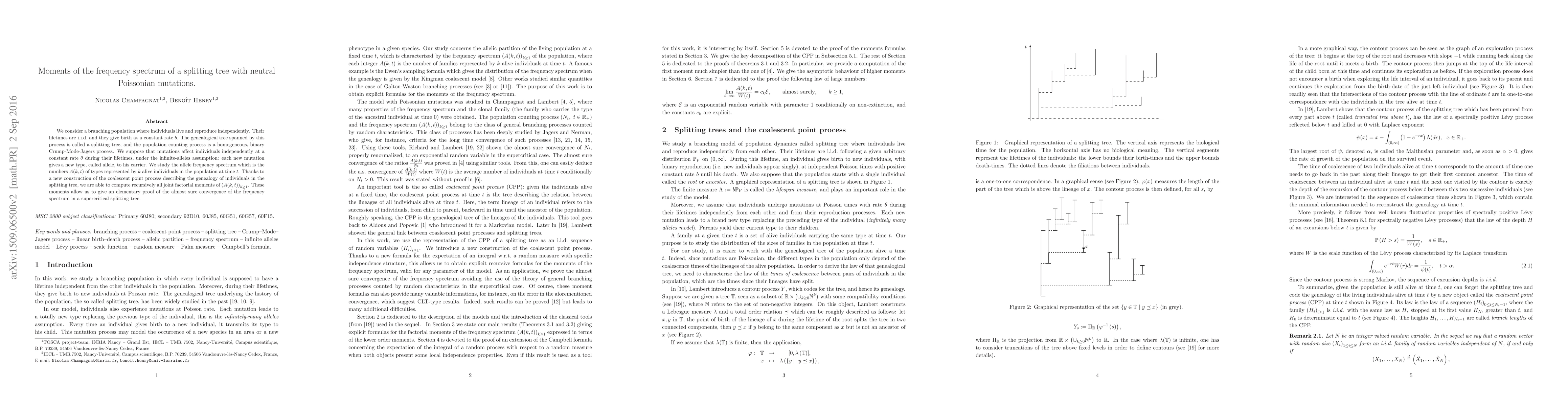 This paper investigates the genealogical tree of a branching population with neutral Poissonian mutations, focusing on the allele frequency spectrum. It employs a novel coalescent point process construction to compute joint factorial moments, providing an elementary proof of the almost sure convergence of the frequency spectrum in a supercritical splitting tree.