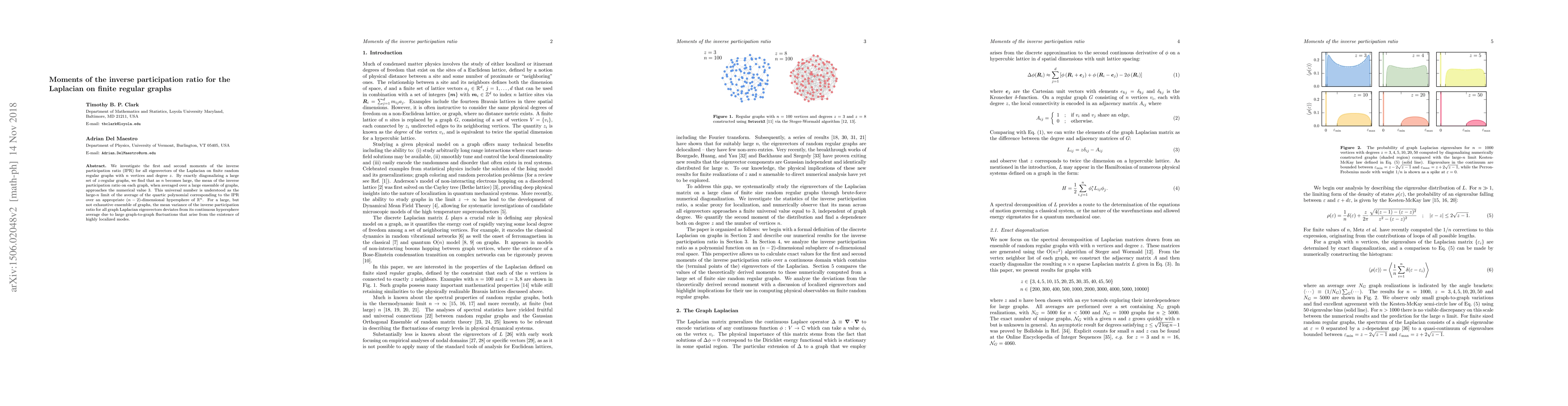 We investigate the first and second moments of the inverse participation ratio (IPR) for all eigenvectors of the Laplacian on finite random regular graphs with $n$ vertices and degree $z$. By exactly diagonalizing a large set of $z$-regular graphs, we find that as $n$ becomes large, the mean of the inverse participation ratio on each graph, when averaged over a large ensemble of graphs, approaches the numerical value $3$. This universal number is understood as the large-$n$ limit of the average of the quartic polynomial corresponding to the IPR over an appropriate $(n-2)$-dimensional hypersphere of $\mathbb{R}^n$. For a large, but not exhaustive ensemble of graphs, the mean variance of the inverse participation ratio for all graph Laplacian eigenvectors deviates from its continuous hypersphere average due to large graph-to-graph fluctuations that arise from the existence of highly localized modes.