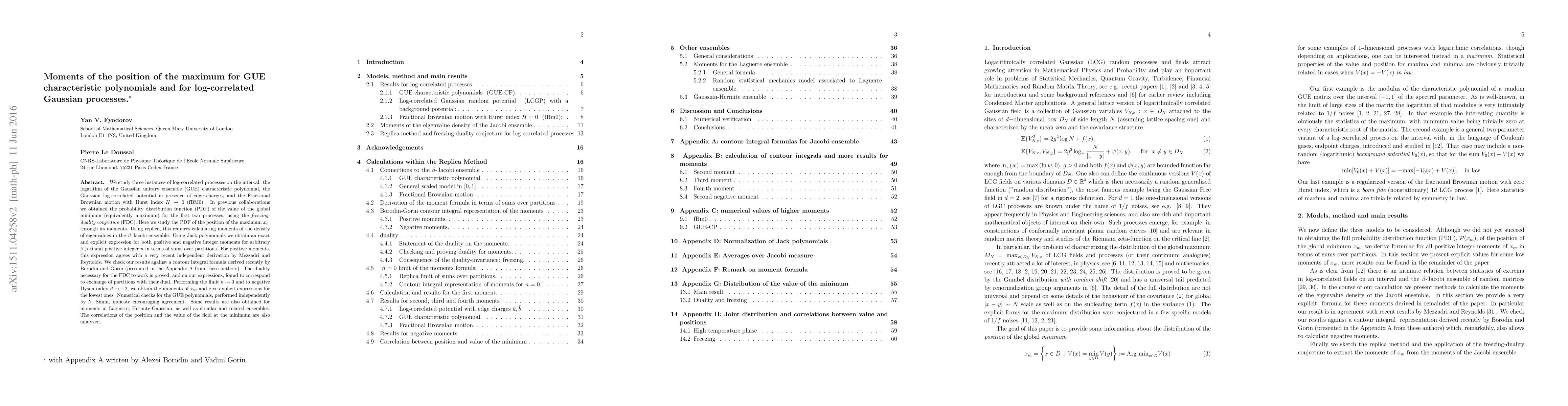 We study three instances of log-correlated processes on the interval: the logarithm of the Gaussian unitary ensemble (GUE) characteristic polynomial, the Gaussian log-correlated potential in presence of edge charges, and the Fractional Brownian motion with Hurst index $H \to 0$ (fBM0). In previous collaborations we obtained the probability distribution function (PDF) of the value of the global minimum (equivalently maximum) for the first two processes, using the {\it freezing-duality conjecture} (FDC). Here we study the PDF of the position of the maximum $x_m$ through its moments. Using replica, this requires calculating moments of the density of eigenvalues in the $\beta$-Jacobi ensemble. Using Jack polynomials we obtain an exact and explicit expression for both positive and negative integer moments for arbitrary $\beta >0$ and positive integer $n$ in terms of sums over partitions. For positive moments, this expression agrees with a very recent independent derivation by Mezzadri and Reynolds. We check our results against a contour integral formula derived recently by Borodin and Gorin (presented in the Appendix A from these authors). The duality necessary for the FDC to work is proved, and on our expressions, found to correspond to exchange of partitions with their dual. Performing the limit $n \to 0$ and to negative Dyson index $\beta \to -2$, we obtain the moments of $x_m$ and give explicit expressions for the lowest ones. Numerical checks for the GUE polynomials, performed independently by N. Simm, indicate encouraging agreement. Some results are also obtained for moments in Laguerre, Hermite-Gaussian, as well as circular and related ensembles. The correlations of the position and the value of the field at the minimum are also analyzed.