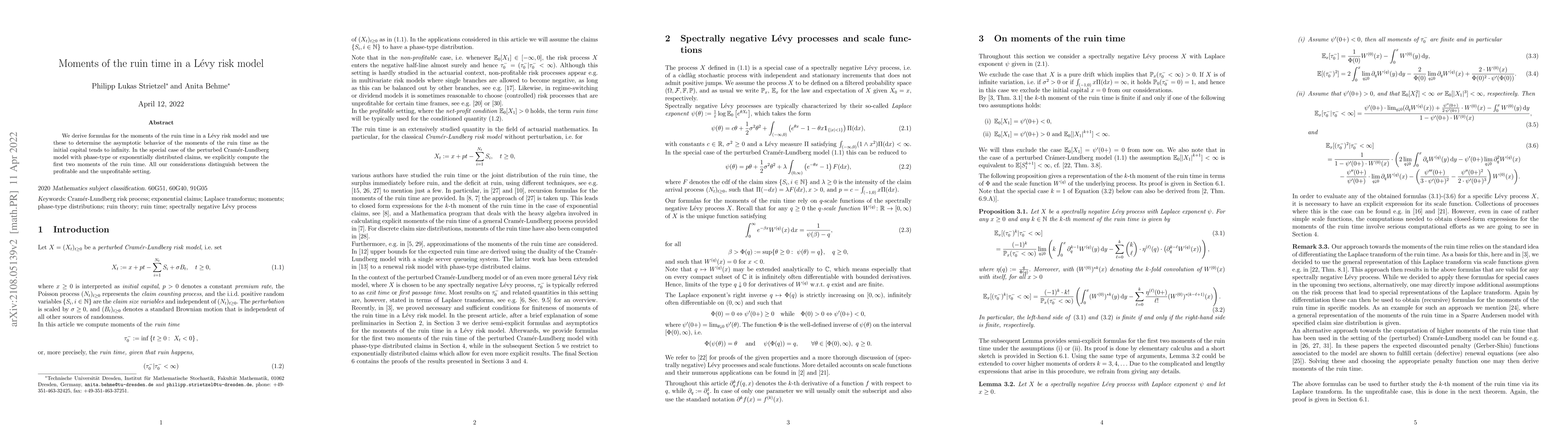 This paper derives formulas for the moments of the ruin time in a Lévy risk model and examines their asymptotic behavior as initial capital increases. It specifically computes the first two moments for the perturbed Cramér-Lundberg model with phase-type or exponentially distributed claims, distinguishing between profitable and unprofitable scenarios.