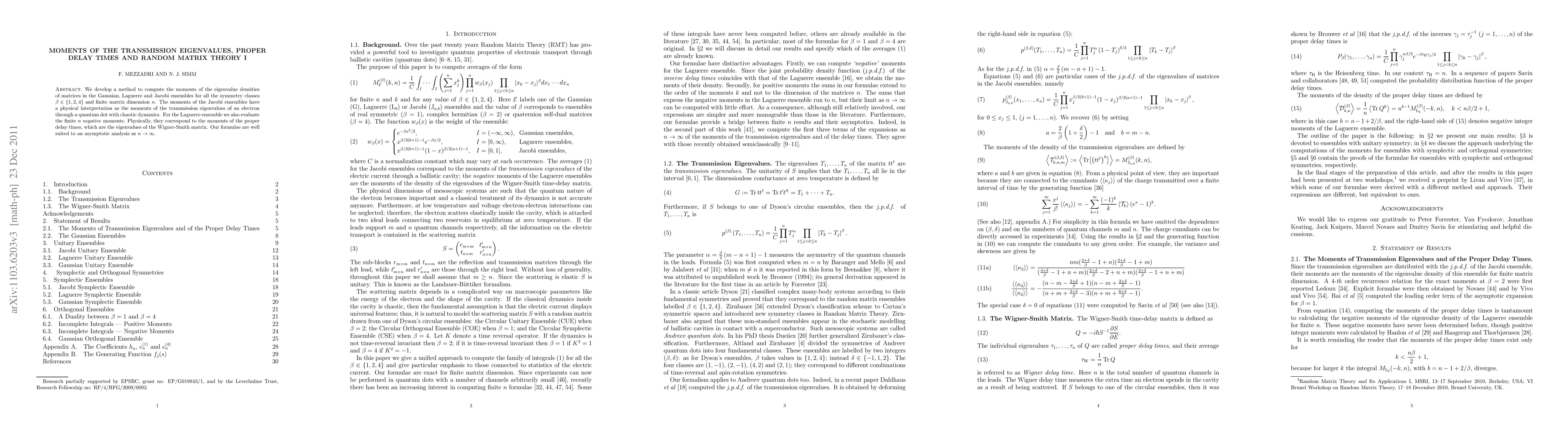 This paper develops a method to compute moments of eigenvalue densities for Gaussian, Laguerre, and Jacobi ensembles, with implications for transmission eigenvalues and proper delay times in quantum systems.