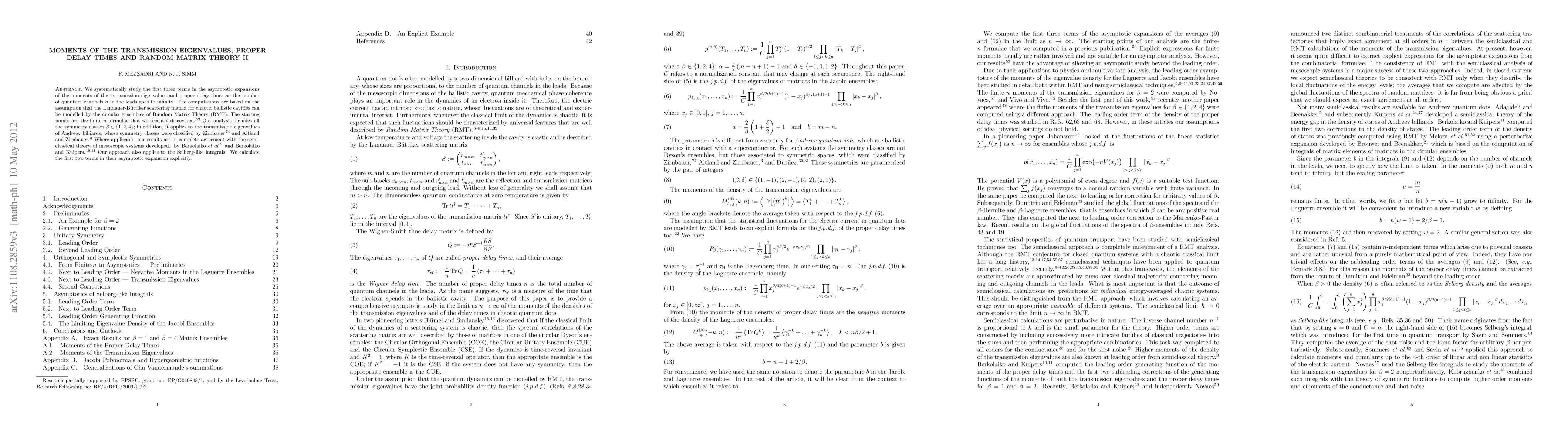 This paper investigates the asymptotic expansions of moments of transmission eigenvalues and proper delay times for quantum channels, leveraging Random Matrix Theory. It confirms results for chaotic ballistic cavities using symmetry classes and aligns with semiclassical mesoscopic systems theory, while also extending the analysis to Andreev billiards and Selberg-like integrals.