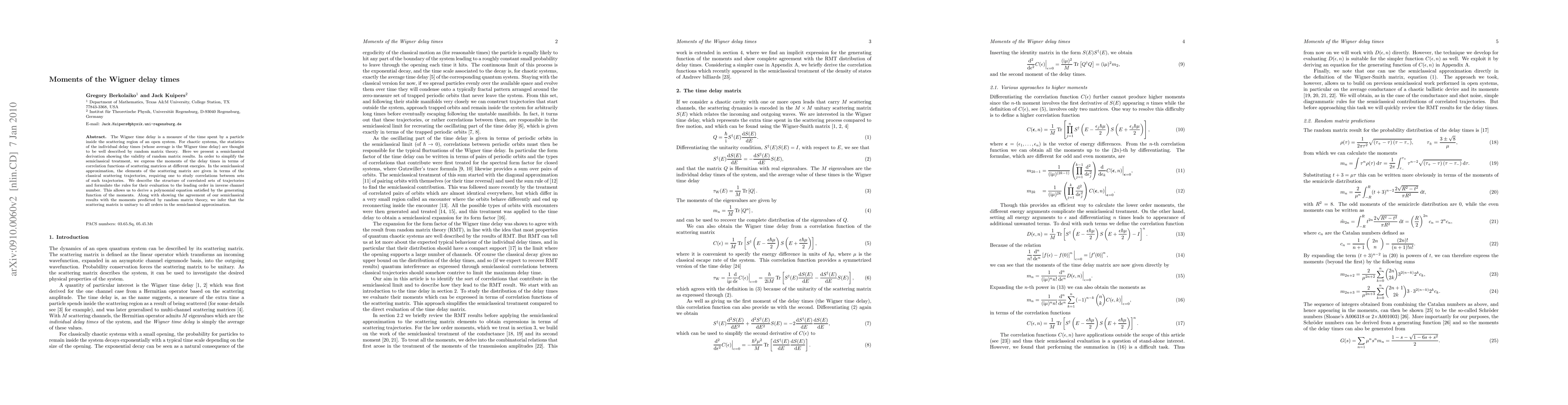 This paper presents a semiclassical derivation validating random matrix theory for the statistics of Wigner time delays in chaotic systems. It expresses the moments of delay times in terms of scattering matrix correlation functions, deriving a polynomial equation for the generating function and confirming unitary scattering matrix properties.