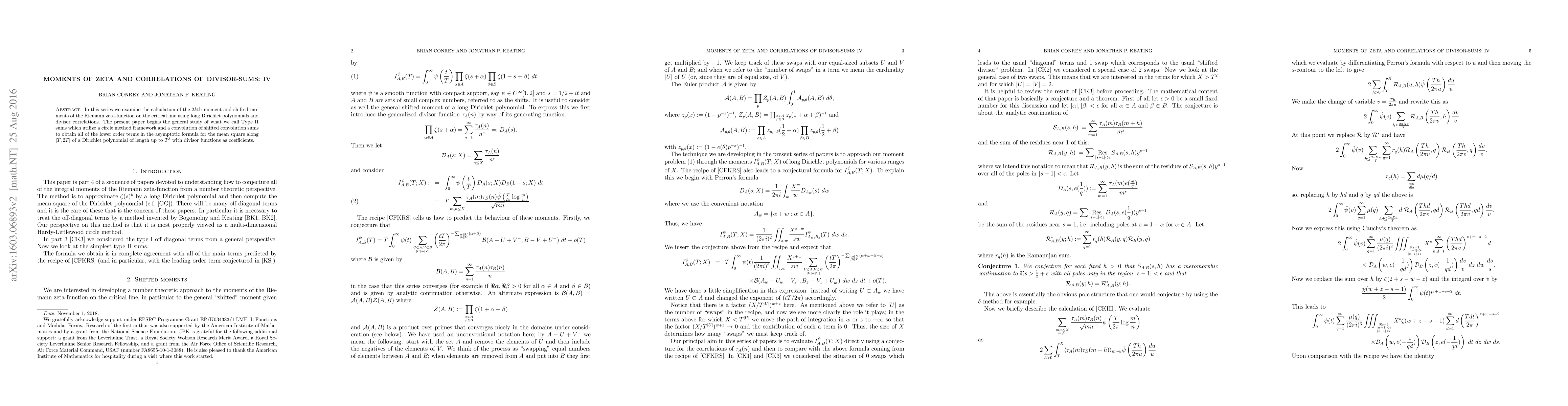 In this series we examine the calculation of the $2k$th moment and shifted moments of the Riemann zeta-function on the critical line using long Dirichlet polynomials and divisor correlations. The present paper begins the general study of what we call Type II sums which utilize a circle method framework and a convolution of shifted convolution sums to obtain all of the lower order terms in the asymptotic formula for the mean square along $[T,2T]$ of a Dirichlet polynomial of length up to $T^3$ with divisor functions as coefficients.