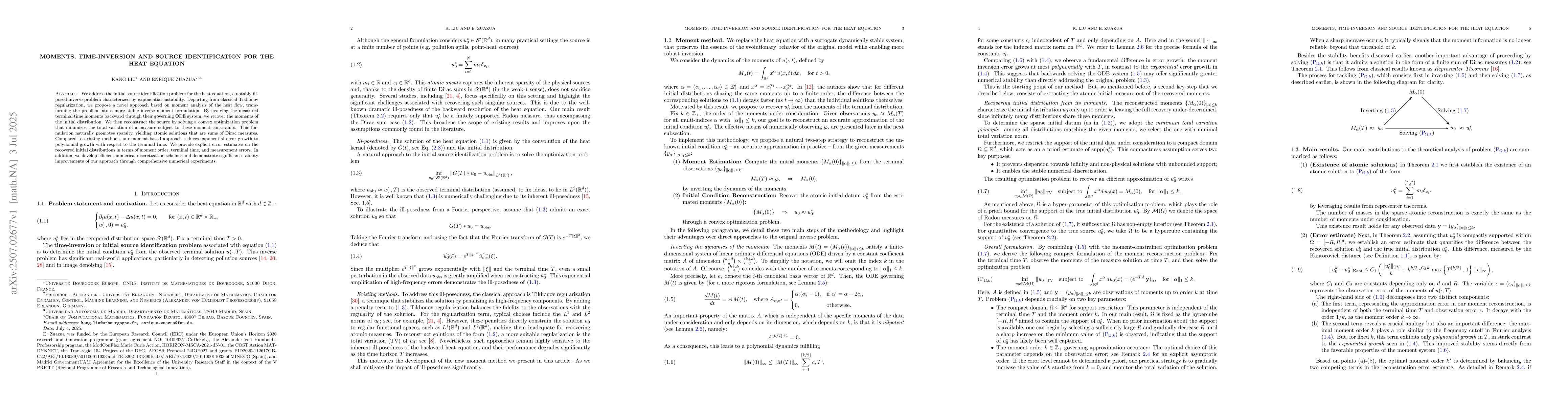 We address the initial source identification problem for the heat equation, a notably ill-posed inverse problem characterized by exponential instability. Departing from classical Tikhonov regularization, we propose a novel approach based on moment analysis of the heat flow, transforming the problem into a more stable inverse moment formulation. By evolving the measured terminal time moments backward through their governing ODE system, we recover the moments of the initial distribution. We then reconstruct the source by solving a convex optimization problem that minimizes the total variation of a measure subject to these moment constraints. This formulation naturally promotes sparsity, yielding atomic solutions that are sums of Dirac measures. Compared to existing methods, our moment-based approach reduces exponential error growth to polynomial growth with respect to the terminal time. We provide explicit error estimates on the recovered initial distributions in terms of moment order, terminal time, and measurement errors. In addition, we develop efficient numerical discretization schemes and demonstrate significant stability improvements of our approach through comprehensive numerical experiments.