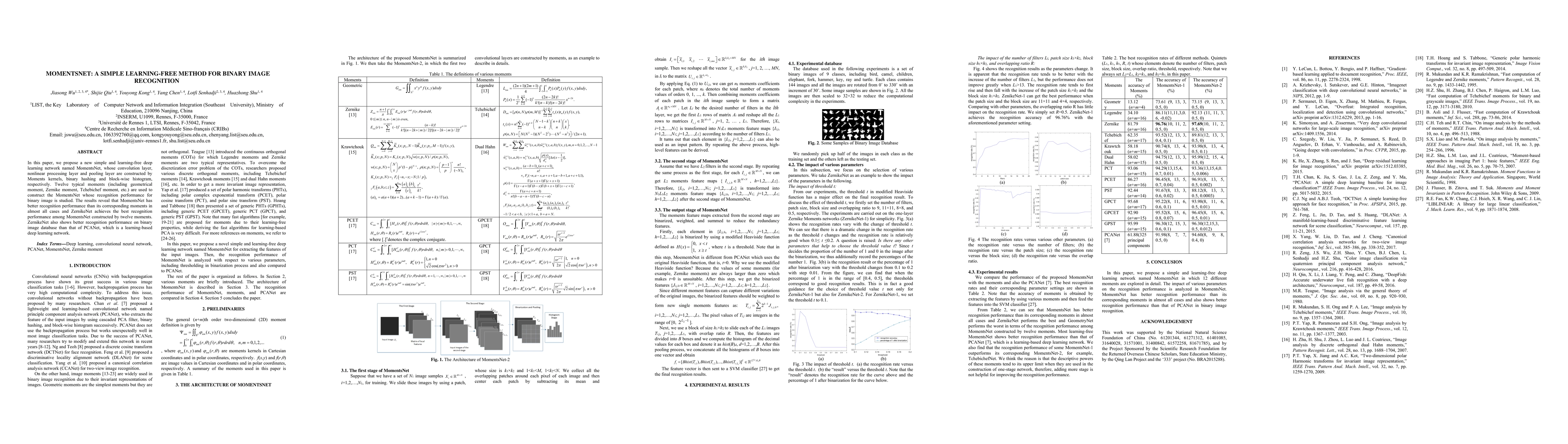 In this paper, we propose a new simple and learning-free deep learning network named MomentsNet, whose convolution layer, nonlinear processing layer and pooling layer are constructed by Moments kernels, binary hashing and block-wise histogram, respectively. Twelve typical moments (including geometrical moment, Zernike moment, Tchebichef moment, etc.) are used to construct the MomentsNet whose recognition performance for binary image is studied. The results reveal that MomentsNet has better recognition performance than its corresponding moments in almost all cases and ZernikeNet achieves the best recognition performance among MomentsNet constructed by twelve moments. ZernikeNet also shows better recognition performance on binary image database than that of PCANet, which is a learning-based deep learning network.