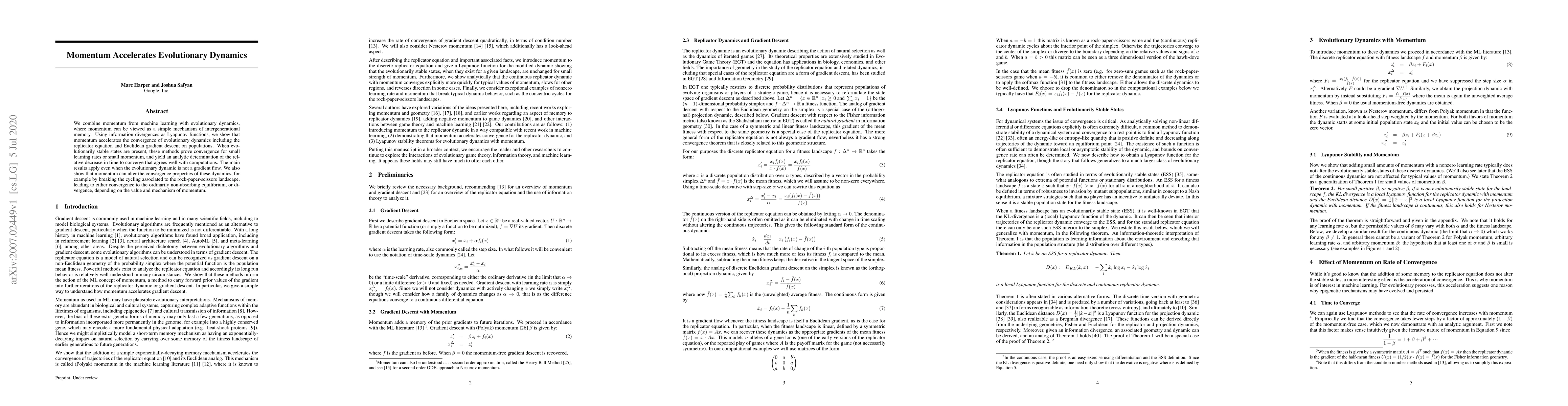 This paper combines machine learning momentum with evolutionary dynamics, demonstrating that momentum accelerates convergence in evolutionary processes like the replicator equation and gradient descent. It shows that momentum can break cycling patterns, leading to either convergence or divergence depending on its value and mechanism.