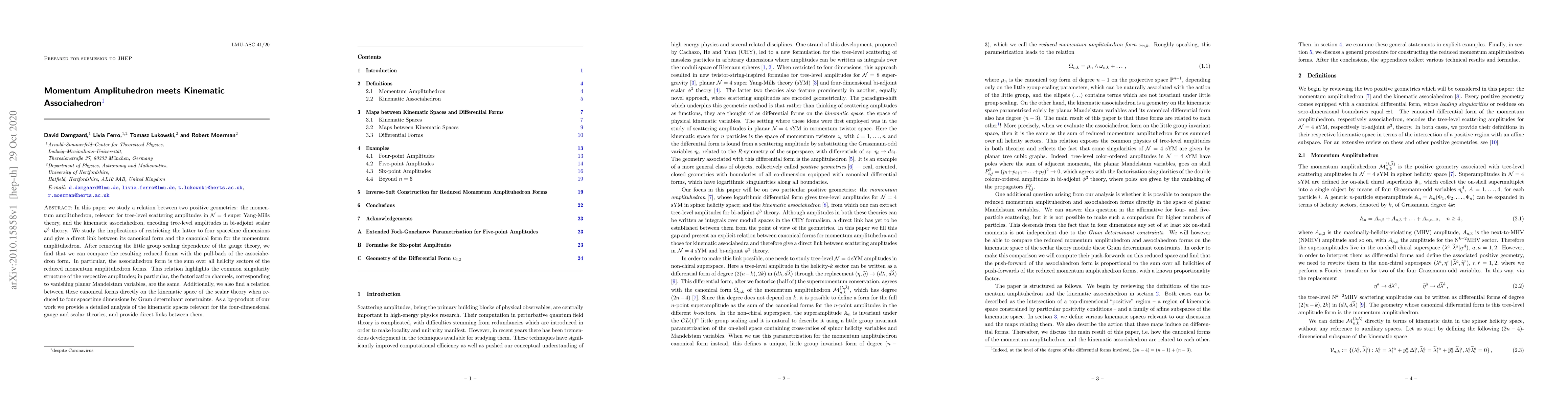 In this paper we study a relation between two positive geometries: the momentum amplituhedron, relevant for tree-level scattering amplitudes in $\mathcal{N} = 4$ super Yang-Mills theory, and the kinematic associahedron, encoding tree-level amplitudes in bi-adjoint scalar $\phi^3$ theory. We study the implications of restricting the latter to four spacetime dimensions and give a direct link between its canonical form and the canonical form for the momentum amplituhedron. After removing the little group scaling dependence of the gauge theory, we find that we can compare the resulting reduced form with the pull-back of the associahedron form. In particular, the associahedron form is the sum over all helicity sectors of the reduced momentum amplituhedron forms. This relation highlights the common singularity structure of the respective amplitudes; in particular the factorization channels, corresponding to vanishing planar Mandelstam variables, are the same. Additionally, we also find a relation between these canonical forms directly on the kinematic space of the scalar theory when reduced to four spacetime dimensions by Gram determinant constraints. As a by-product of our work we provide a detailed analysis of the kinematic spaces relevant for the four-dimensional gauge and scalar theories, and provide direct links between them.