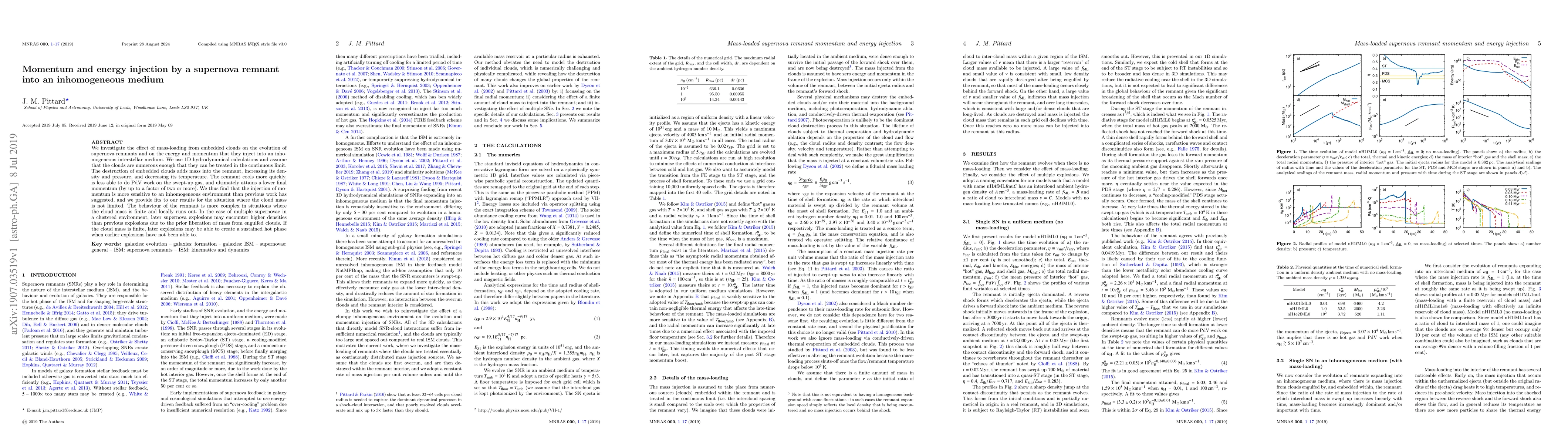 This paper examines how supernova remnants evolve in an inhomogeneous medium, finding that mass-loading from embedded clouds significantly reduces the remnant's momentum injection. The destruction of clouds increases the remnant's density and pressure, leading to quicker cooling and lower final momentum.