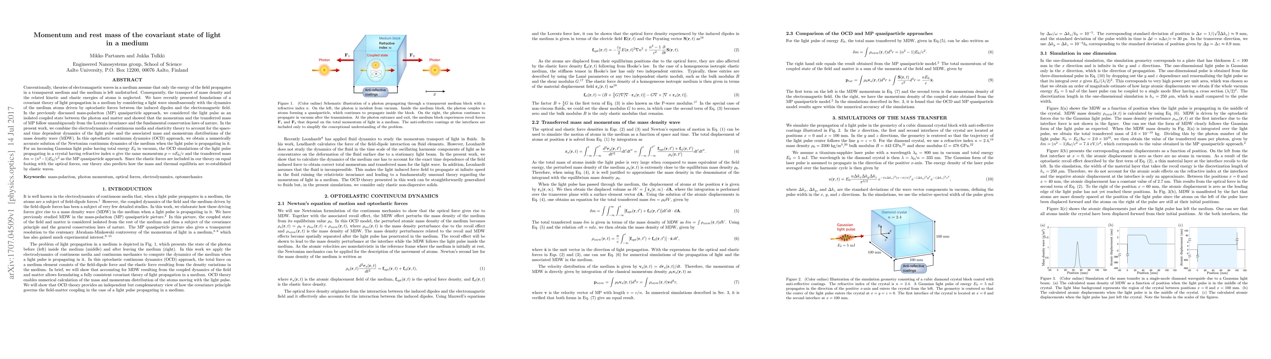 Conventionally, theories of electromagnetic waves in a medium assume that only the energy of the field propagates in a transparent medium and the medium is left undisturbed. Consequently, the transport of mass density and the related kinetic and elastic energies of atoms is neglected. We have recently presented foundations of a covariant theory of light propagation in a medium by considering a light wave simultaneously with the dynamics of the medium atoms driven by optoelastic forces between the induced dipoles and the electromagnetic field. In the previously discussed mass-polariton (MP) quasiparticle approach, we considered the light pulse as an isolated coupled state between the photon and matter and showed that the momentum and the transferred mass of MP follow unambiguously from the Lorentz invariance and the fundamental conservation laws of nature. In the present work, we combine the electrodynamics of continuous media and elasticity theory to account for the space- and time dependent dynamics of the light pulse and the associated mass and momentum distributions of the mass density wave (MDW). In this optoelastic continuum dynamics (OCD) approach, we obtain a numerically accurate solution of the Newtonian continuum dynamics of the medium when the light pulse is propagating in it. For an incoming Gaussian light pulse having total energy $E_0$ in vacuum, the OCD simulations of the light pulse propagating in a crystal having refractive index $n$ give the same momentum $p=nE_0/c$ and the transferred mass $\delta m=(n^2-1)E_0/c^2$ as the MP quasiparticle approach. Since the elastic forces are included in our theory on equal footing with the optical forces, our theory also predicts how the mass and thermal equilibria are re-established by elastic waves.