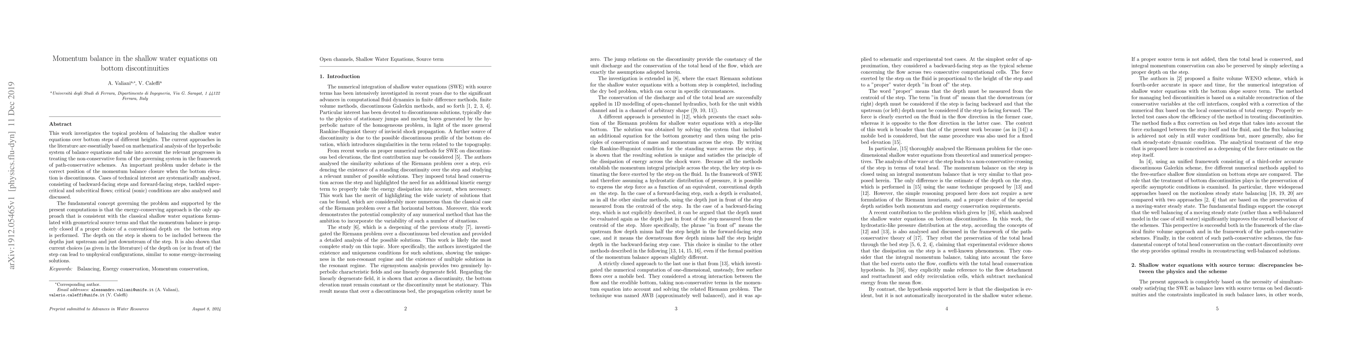 This paper examines the momentum balance in shallow water equations over bottom discontinuities, arguing that the energy-conserving approach is consistent with the classical shallow water equations. It demonstrates that the proper choice of depth on the step is crucial for closing the momentum balance and avoiding unphysical configurations.