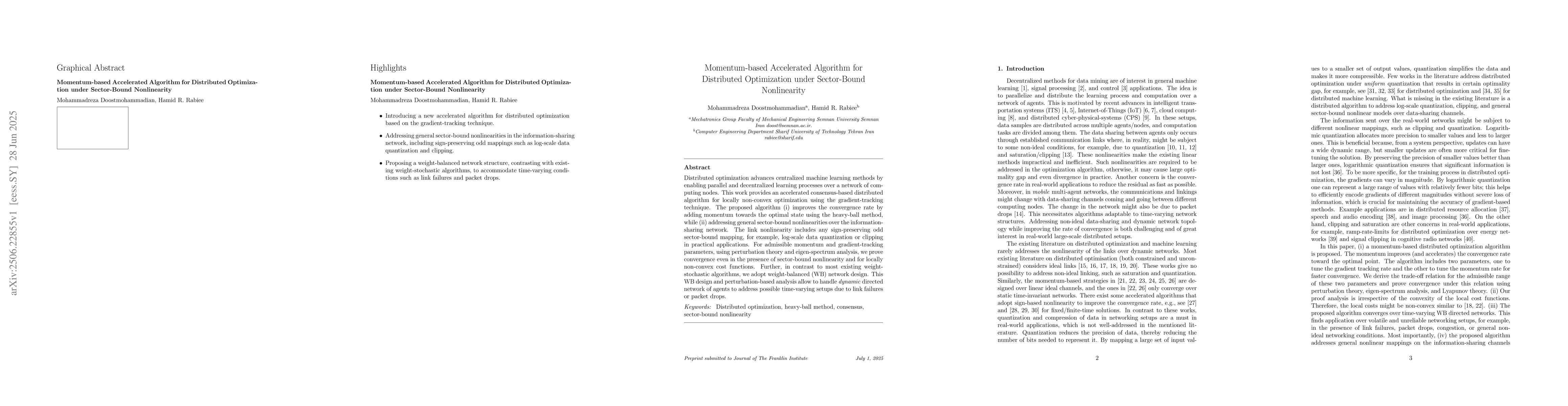 Distributed optimization advances centralized machine learning methods by enabling parallel and decentralized learning processes over a network of computing nodes. This work provides an accelerated consensus-based distributed algorithm for locally non-convex optimization using the gradient-tracking technique. The proposed algorithm (i) improves the convergence rate by adding momentum towards the optimal state using the heavy-ball method, while (ii) addressing general sector-bound nonlinearities over the information-sharing network. The link nonlinearity includes any sign-preserving odd sector-bound mapping, for example, log-scale data quantization or clipping in practical applications. For admissible momentum and gradient-tracking parameters, using perturbation theory and eigen-spectrum analysis, we prove convergence even in the presence of sector-bound nonlinearity and for locally non-convex cost functions. Further, in contrast to most existing weight-stochastic algorithms, we adopt weight-balanced (WB) network design. This WB design and perturbation-based analysis allow to handle dynamic directed network of agents to address possible time-varying setups due to link failures or packet drops.