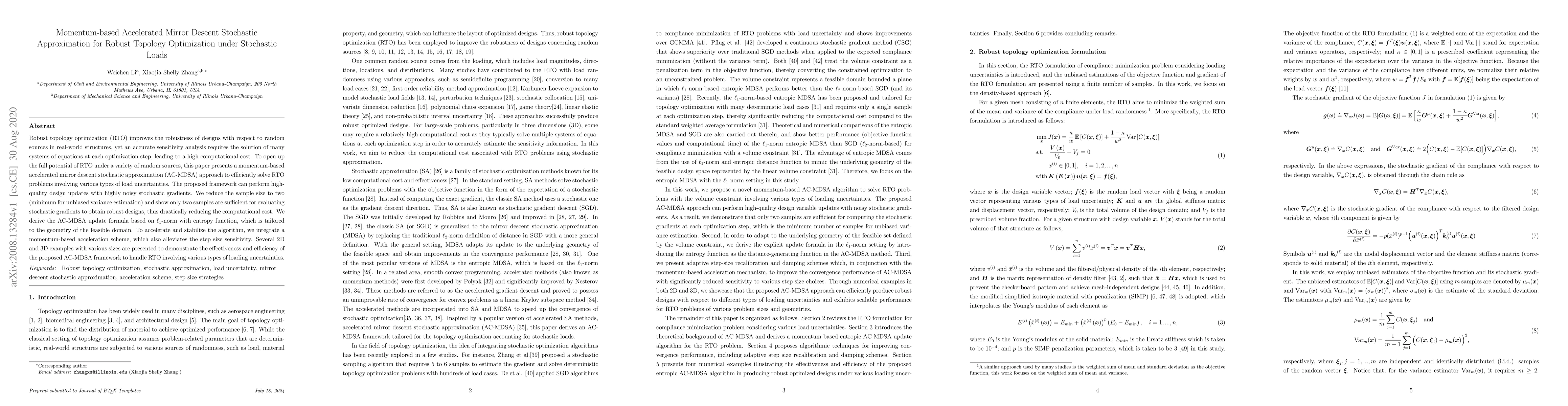 This paper introduces a momentum-based accelerated mirror descent stochastic approximation (AC-MDSA) approach for robust topology optimization under stochastic loads, significantly reducing computational costs by requiring only two samples for gradient evaluation. The proposed method efficiently handles various load uncertainties and demonstrates effectiveness through multiple 2D and 3D examples.