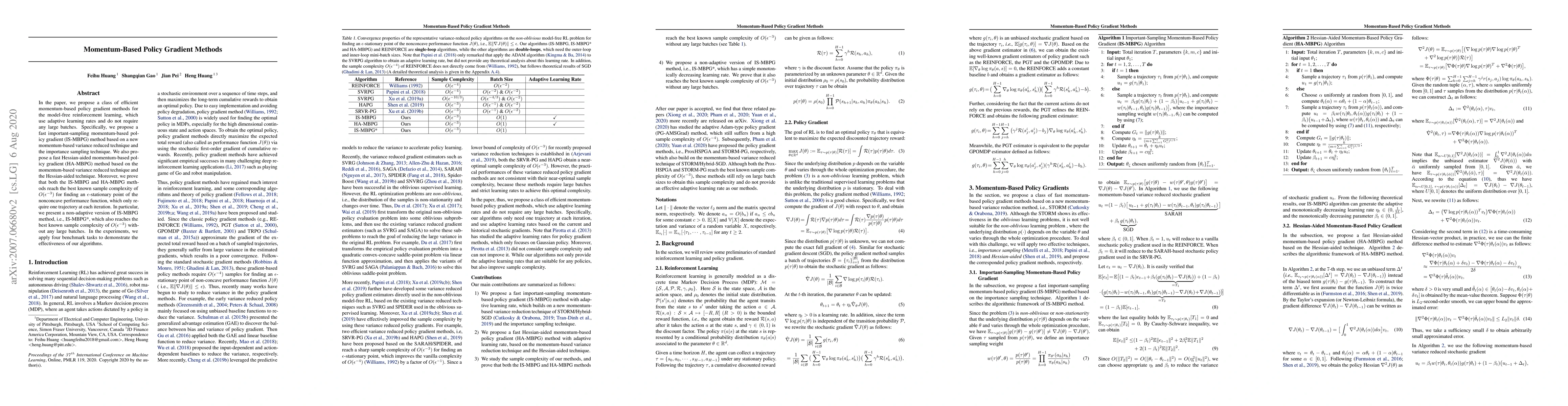 This paper introduces momentum-based policy gradient methods for model-free reinforcement learning, including IS-MBPG and HA-MBPG, which achieve optimal sample complexity without large batches. Both methods demonstrate effectiveness across benchmark tasks.