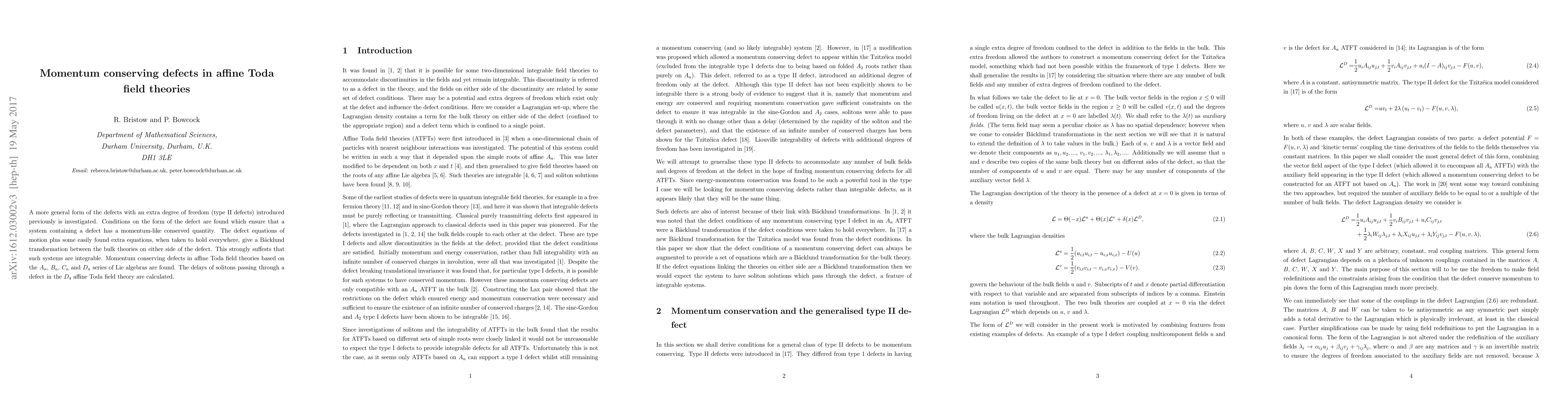 Type II integrable defects with more than one degree of freedom at the defect are investigated. A condition on the form of the Lagrangian for such defects is found which ensures the existence of a conserved momentum in the presence of the defect. In addition it is shown that for any Lagrangian satisfying this condition, the defect equations of motion, when taken to hold everywhere, can be extended to give a B\"{a}cklund transformation between the bulk theories on either side of the defect. This strongly suggests that such systems are integrable. Momentum conserving defects and B\"{a}cklund transformations for affine Toda field theories based on the $A_n$, $B_n$, $C_n$ and $D_n$ series of Lie algebras are found. The defect associated with the $D_4$ affine Toda field theory is examined in more detail. In particular classical time delays for solitons passing through the defect are calculated.